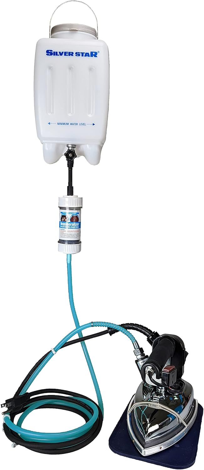 Silver Star irons use gravity to provide the water flow and pressure that allows the iron to produce its own very dry, voluminous steam. Silver Star gravity feed irons easily open seams, flatten darts, set pleats instantly, give sharper creases and more! Super easy to use! Silver Star gravity-feed irons are extremely energy efficient and simple to maintain. Also, the built-in sheathed wire heater improves thermal efficiency, shortens heating time, and offers economic efficiency. Just fill up the included 1-gallon plastic tank, hang it above your work surface, install the included demineralizer cartridge into the water line to eliminate the need for distilled water, and you’re all set! A Silver Star iron is a rugged product, built to withstand years of use. Its comfortable and sleek design allows you to get to those hard-to-reach areas. This kit also includes an in-line demineralizer cartridges and an ironing shoe that is light and perfect for ironing taffeta, gabardine, nylon and any synthetic material with no shine or scorch.