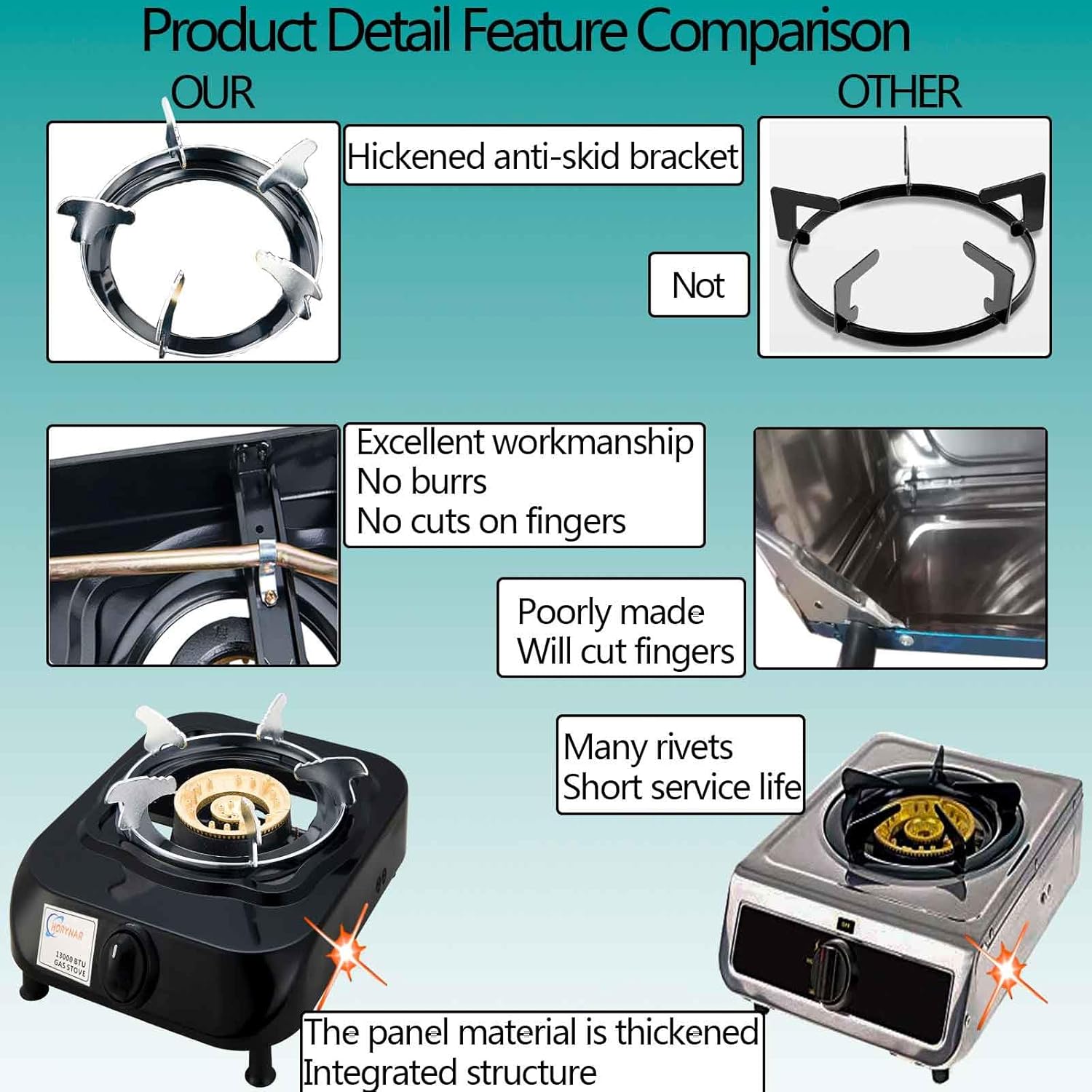 STURDY & WELL MADE – The single gas burner adopts an integral thickened stainless steel design. There are no rivets on the exterior surface. One-piece panel design,Very sturdy. Inside edge rounding process. Will not cut your fingers