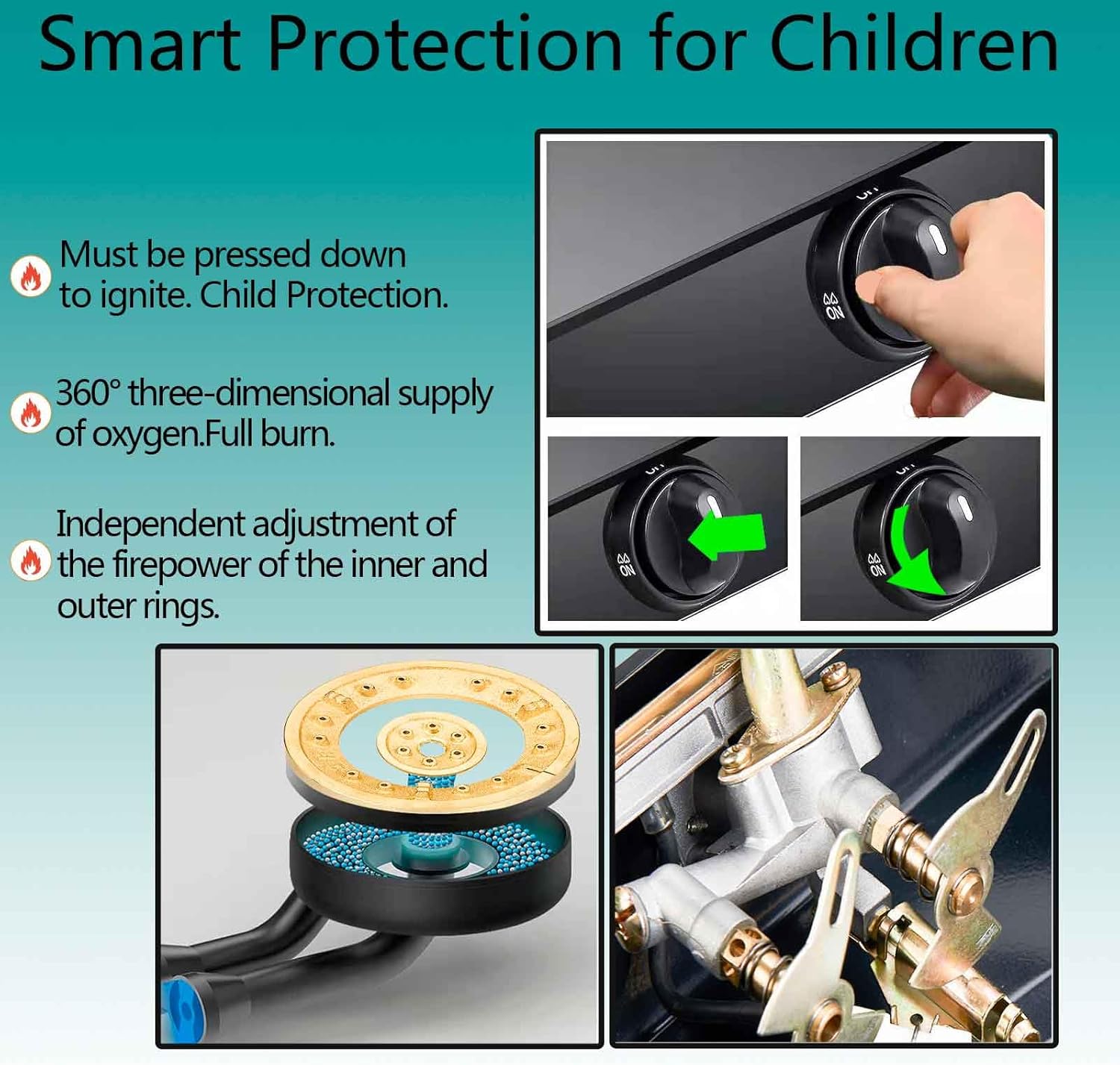 The switch of the single gas burner needs to be pressed down to ignite. Effectively protect the safety of children’s lives.