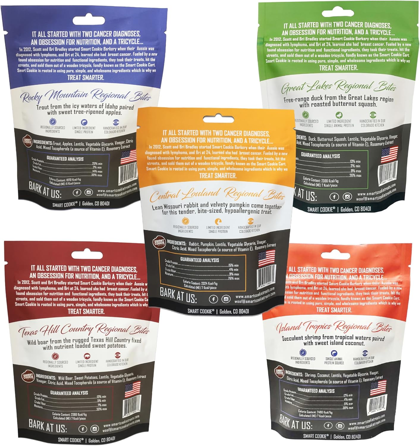 These grain free, limited ingredient, soft and chewy treats will be a hit with any pup looking for treats for their sensitive stomach or allergies. Healthy bite sized treats for large or small dogs. Low in fat and high in protein these hypoallergenic dog treats are inspired by local regions across the USA.This Soft & Chewy Dog Treat Variety Pack features:Island Tropics Shrimp + Coconut – 5oz