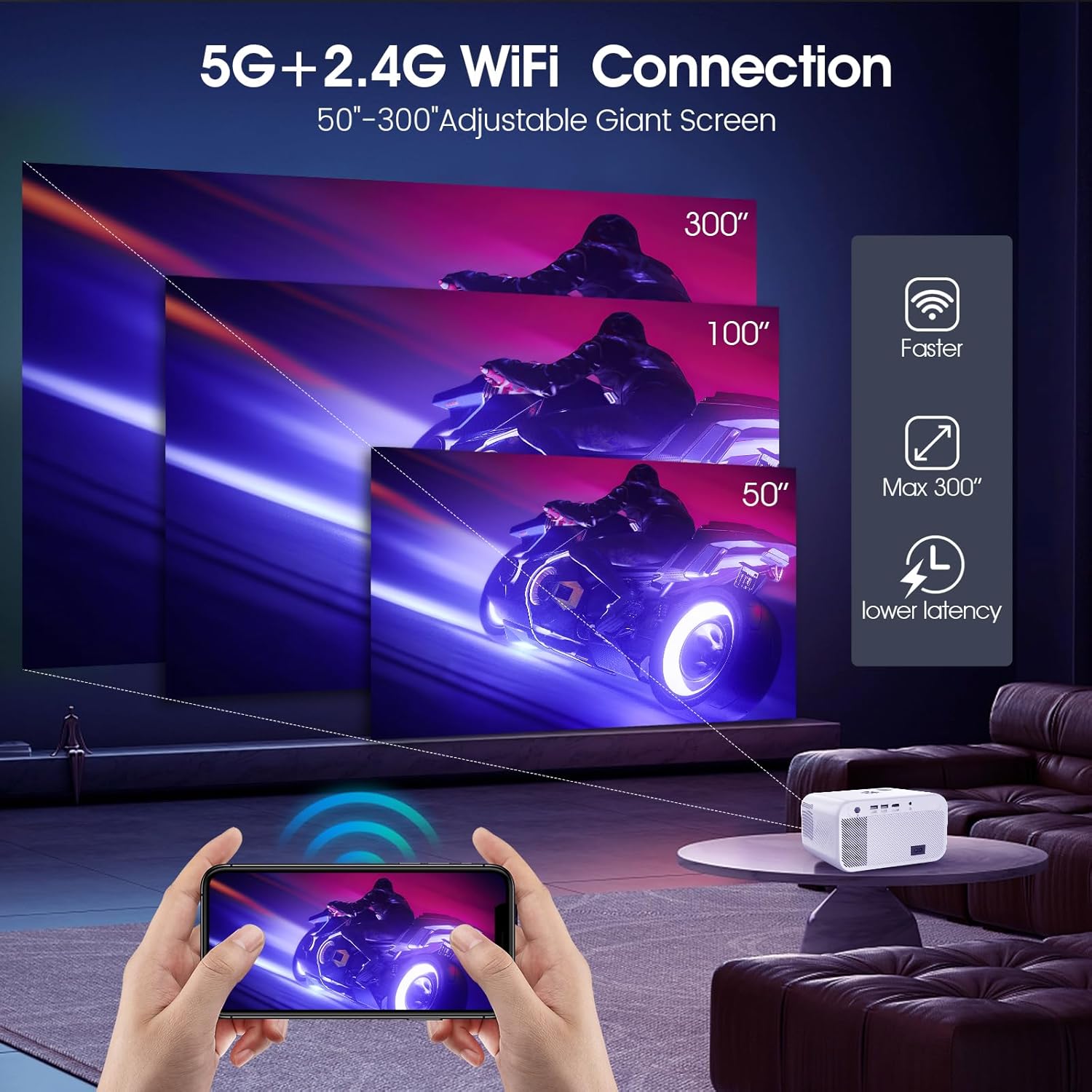 The TIATELE T5 projector features dual-band 5G/2.4G WiFi and Bluetooth 5 for fast, stable connections and improved audio quality. With two-way Bluetooth, it can stream audio to mobile devices or pair with external Bluetooth speakers, headphones, and soundbars to elevate your home theater experience. Note: Bluetooth supports audio transmission only, not video.