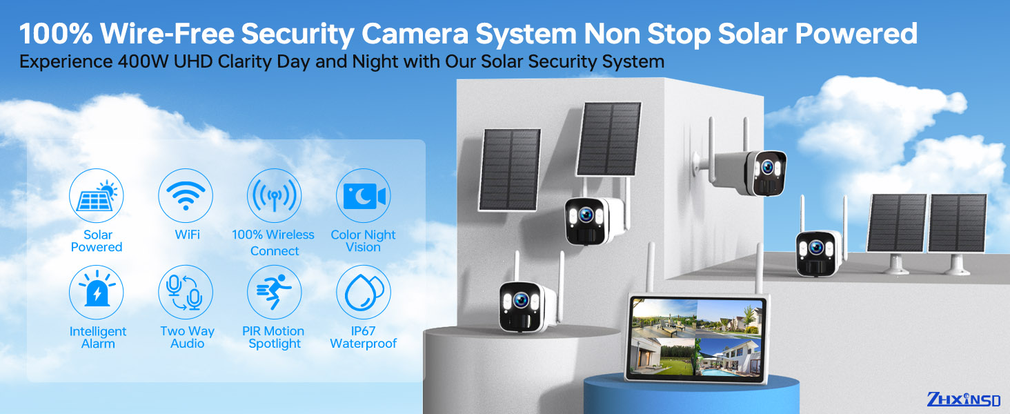 All in One Security System: ZHXINSD solar security camera system equiped with 10 inch monitor(not touch screen). Easy set up and use, all the cameras are paired before shipping. Wireless cameras for home security. Priority security system for family, office, store, warehouse.
