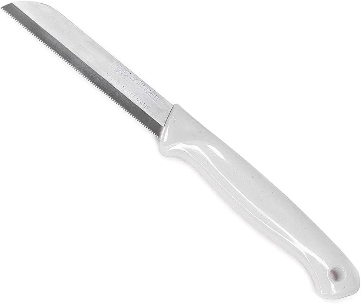 6 Solingen Serrated Fruit Knives. Product color: White. Total length: 18 cm, blade length 8 cm. Made in Germany. Made of five carbon alloys, German stainless steel. Multi-purpose fruit knife, vegetable knife. Serrated blade eliminates the need for sharpening. Extra sharp. Handle is made of certified, food-safe polypropylene. Ergonomic design for comfortable use. Dishwasher safe. Shipped in a special box.
