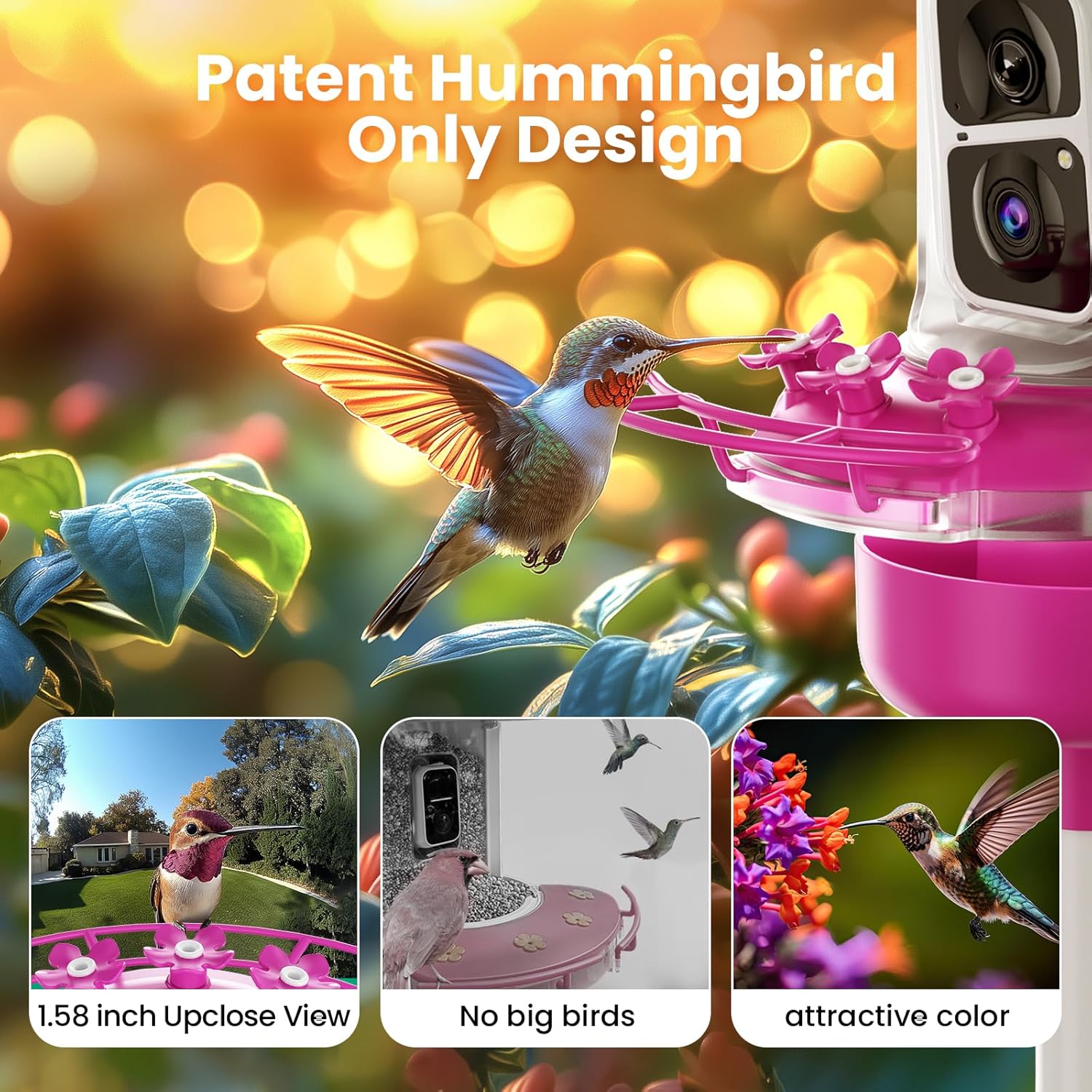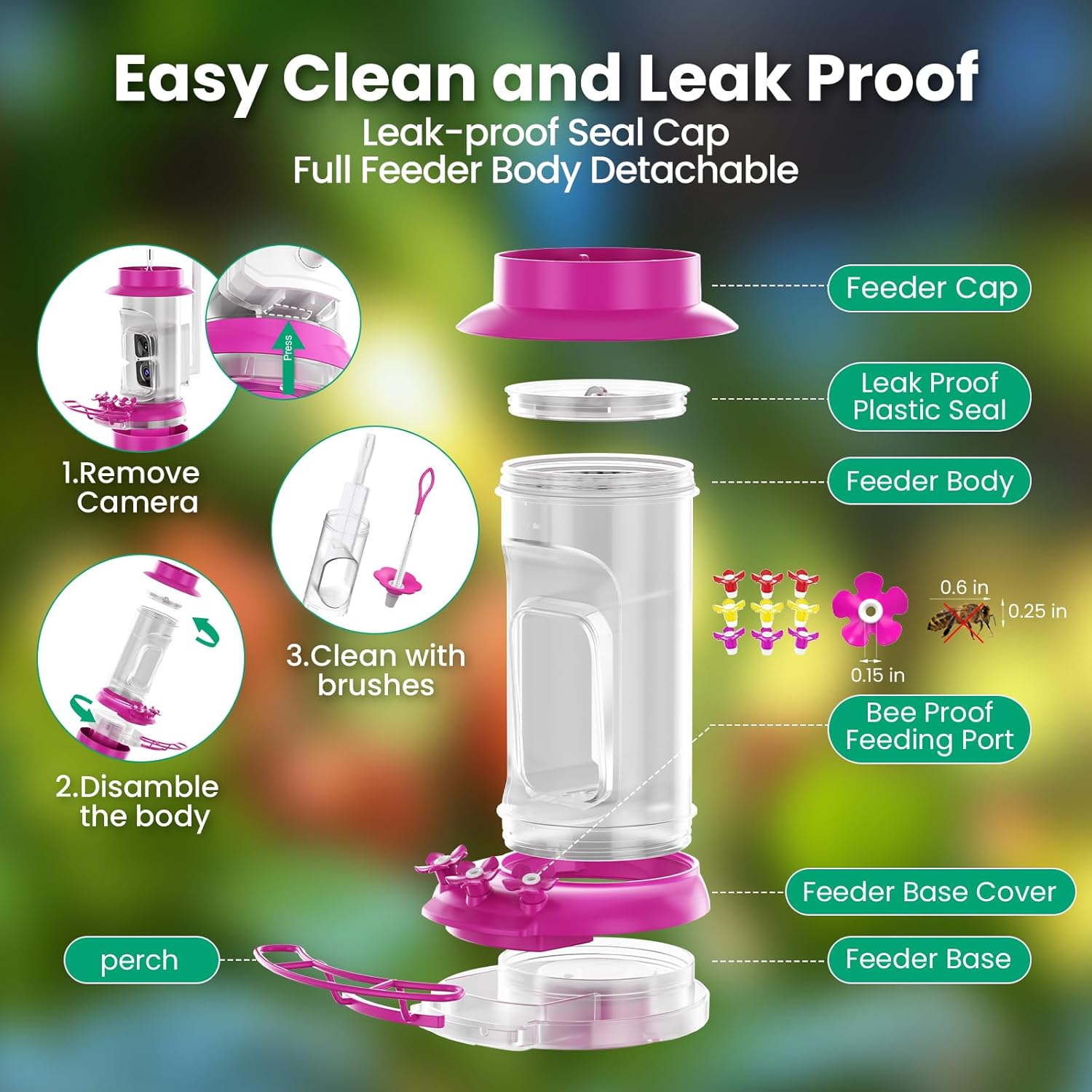 Hummingbird attractive & User-Friendly Design- The Hummingbird feeder camera BF10 is made from safe, BPA-free plastic with a transparent container that attracts hummingbirds and allows for easy monitoring of nectar levels; The camera in the bird feeder is easy to slide in and out for simple recharging; The double-side open nectar tank allows for convenient cleaning and is dishwasher safe; The feeder also comes with a cleaning brush, hanging hook, and ant-proof pole holder