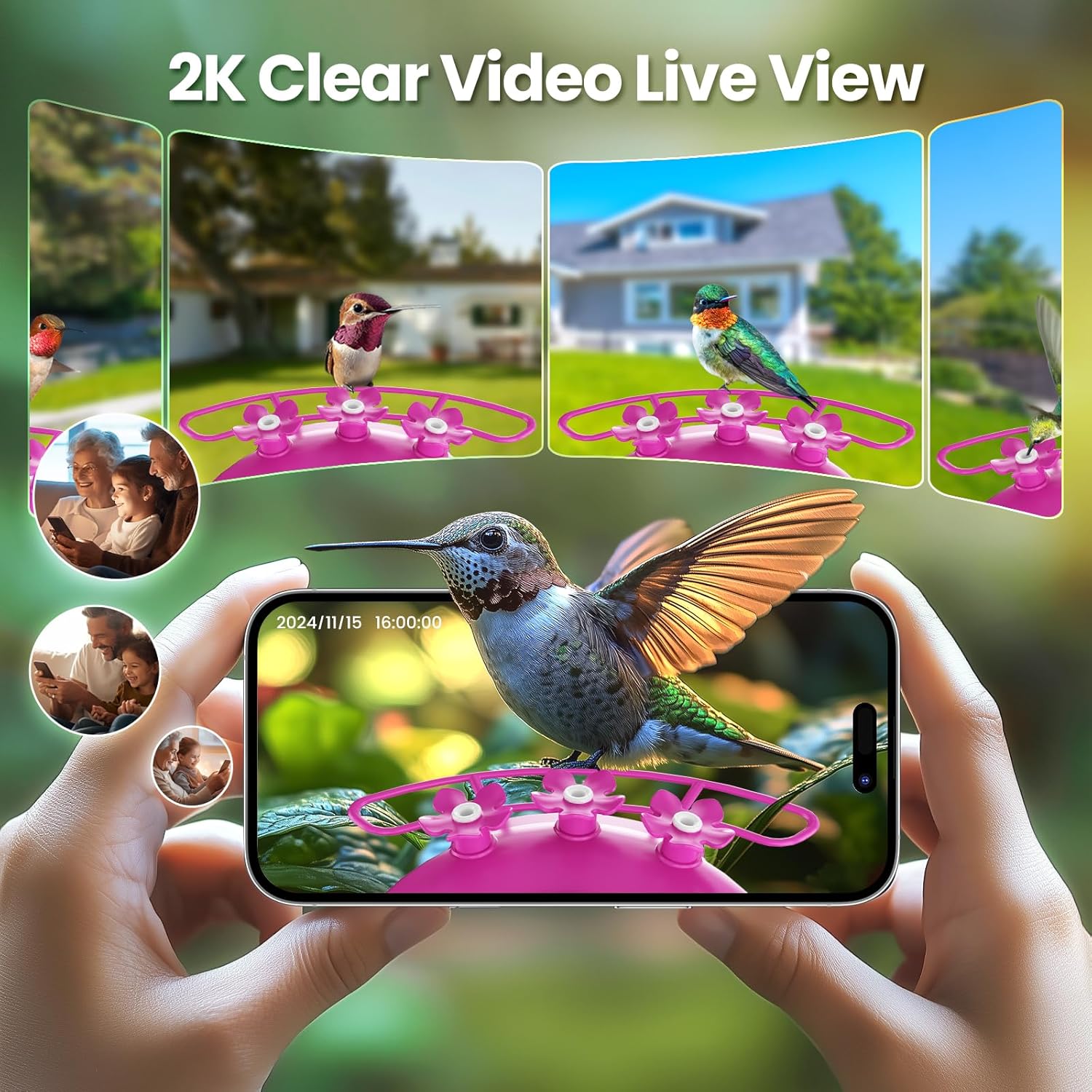 Watch Humming Birds with 2k HD High Resolution: The smart hummingbird feeder with camera can auto-capture and record videos of the hummingbirds that visit. You will receive instant real-time notifications with a snapshot image and video via the phone app or live view the tiny creatures up close at 2.7 inches and 2K high-resolution