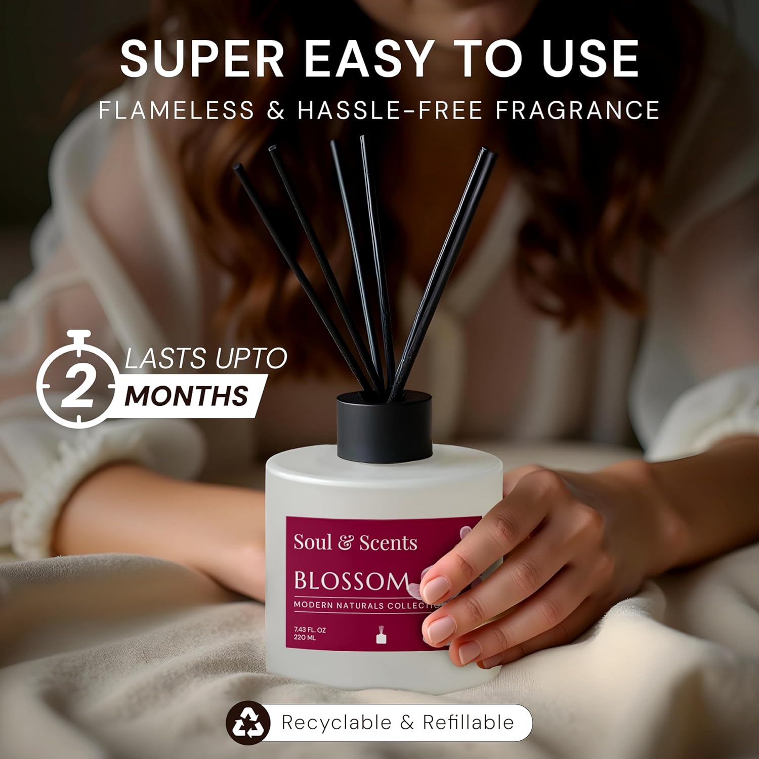Soul & Scents Reed Diffuser Set – Blossom | 7.43 oz Refillable Scented Oil with 6 Fiber Sticks | Long-Lasting Home Fragrance & Air Freshener for Bedroom, Bathroom, Office | Gift & Décor Piece