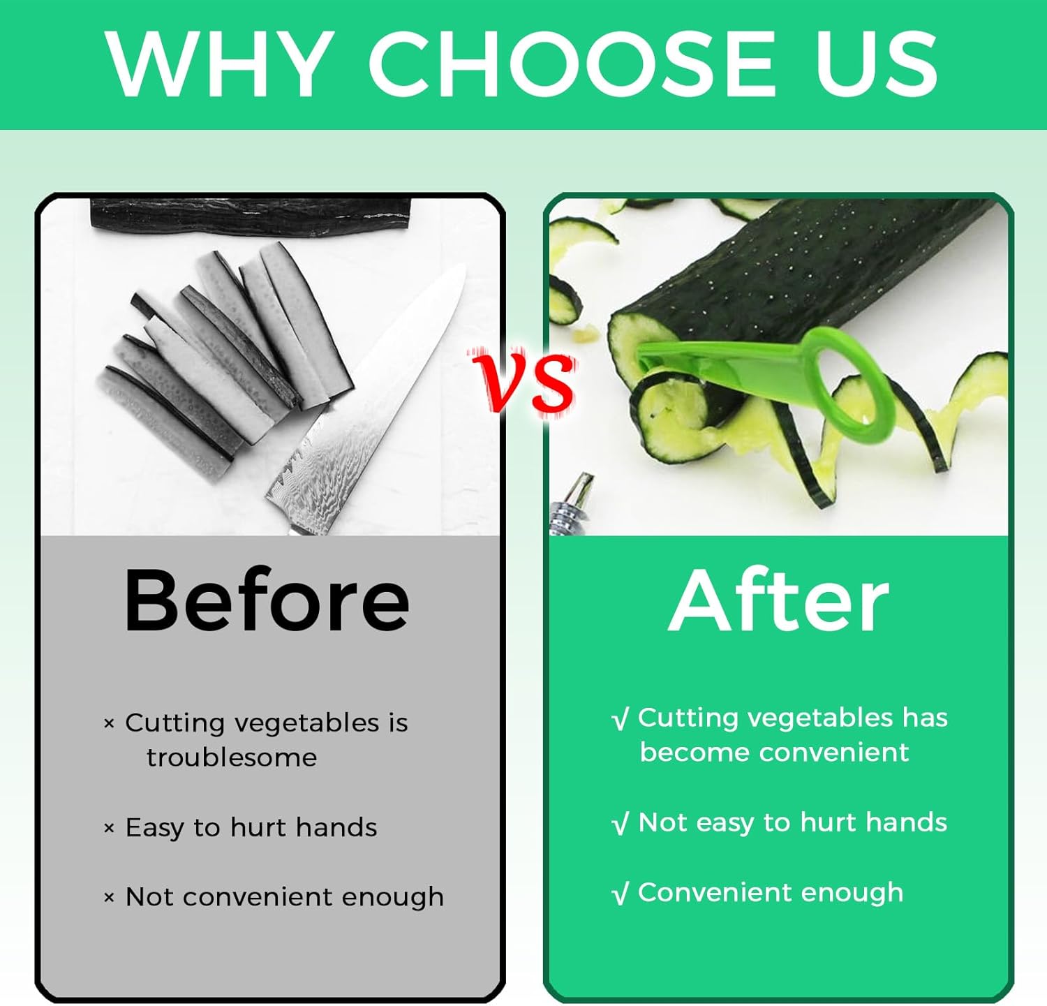 Dual-Material Construction: Combines durable stainless steel blades with lightweight plastic handles. The stainless steel spiralizer ensures long-lasting sharpness, while ergonomic plastic designs provide comfortable, non-slip grip during use.