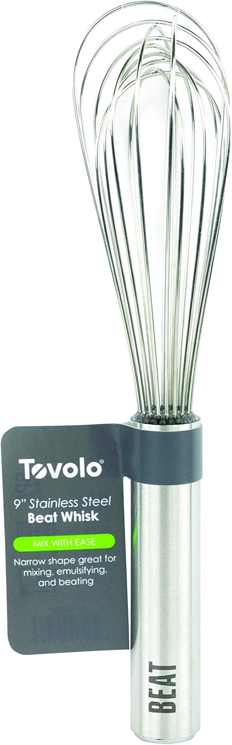 Embrace your inner chef with the Stainless Steel 9″ Beat Whisk from Tovolo. This cooking and baking tool is perfect for whisking up sauces, vinaigrettes, homemade mayonnaise, batters, and custards. The classic French whisk handles a variety of kitchen tasks effortlessly. Slender, cylindrical shape fits into tight spaces while the decreased space between wires suits it for sauces, salad dressings, and other liquids that can flow between the whisk wires. Springy wires with wide gaps incorporate more air into your light, fluffy batters, meringues, and whipped cream. The steel wire bends just enough to give as you whisk, but will not warp or bend out of shape. The sleek, stylish handles feature etched labels that will never fade or peel, so you will always be able to find the right tool for the job quickly and easily. The sturdy stainless steel wires do not bend as you whisk, whip, stir, mix, and combine ingredients. The handle fits comfortably in hand, and the entire kitchen utensil is dishwasher safe for maximum convenience. The high-quality stainless steel material, sturdy construction and the performance you know and love are all packed into this durable whisk. The super-versatile 9” Beat Whisk is perfect for eggs, batter, gravy and more.
