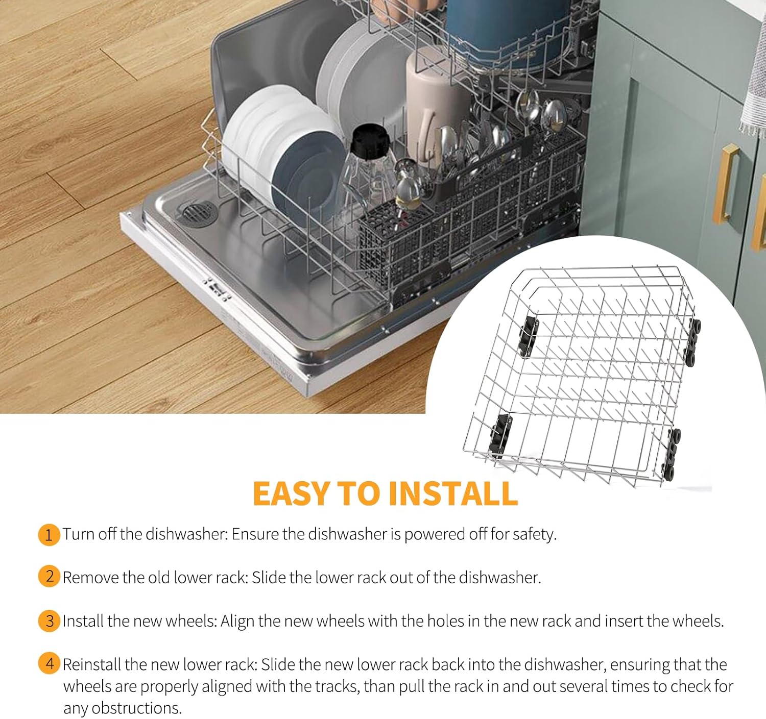 【EASY TO INSTALL】1. Turn off the dishwasher: Ensure the dishwasher is powered off for safety. 2. Remove the old lower rack: Slide the lower rack out of the dishwasher. 3. Install the wheels: You need to transfer the original rollers to the new lower rack. Align the wheels in the new rack and insert the wheels. 4. Reinstall the new lower rack: Slide the new lower rack back into the dishwasher, ensuring that the wheels are properly aligned with the tracks, than pull the rack in and out several times to check for any obstructions