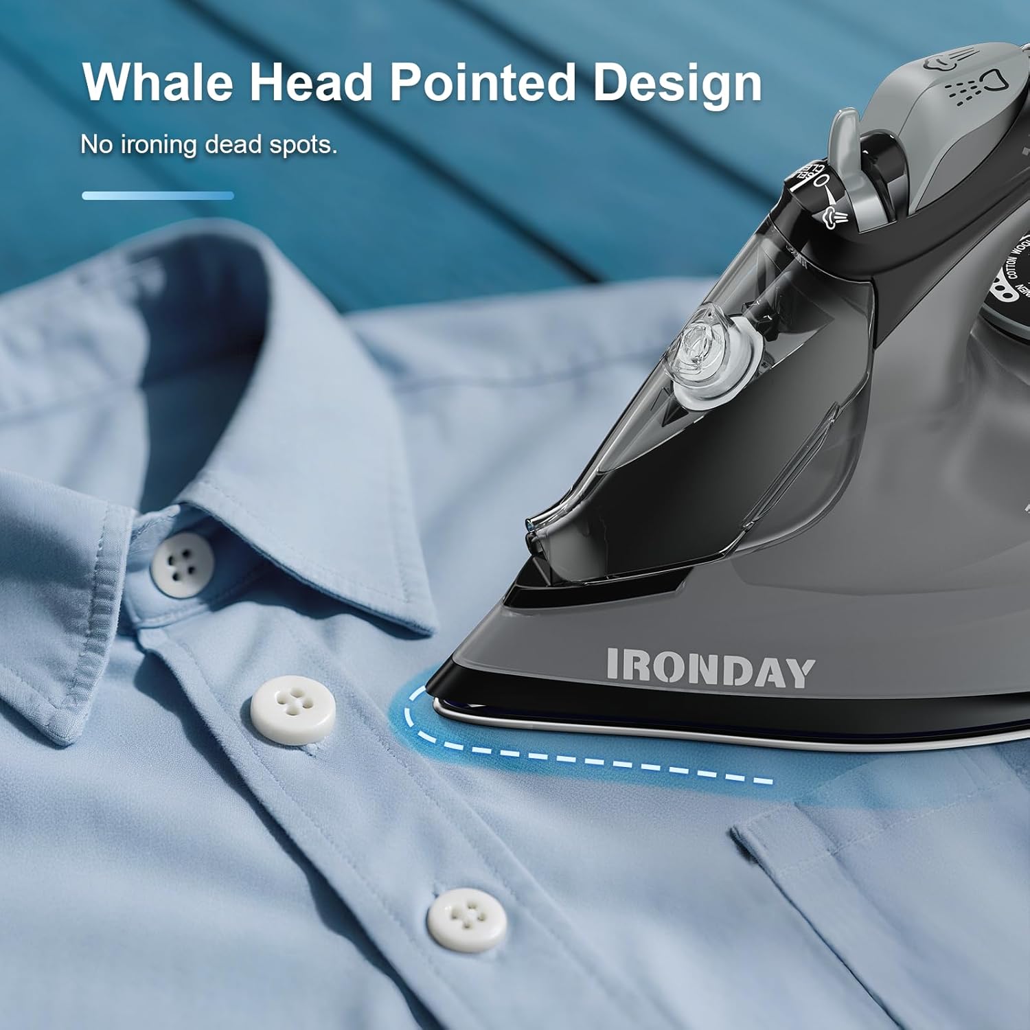 【1800W Steam Iron】 The Ironday 1800W high-power steam iron heats up in just 20 seconds, while its non-stick ceramic soleplate ensures even heat distribution for consistently smooth and efficient ironing.