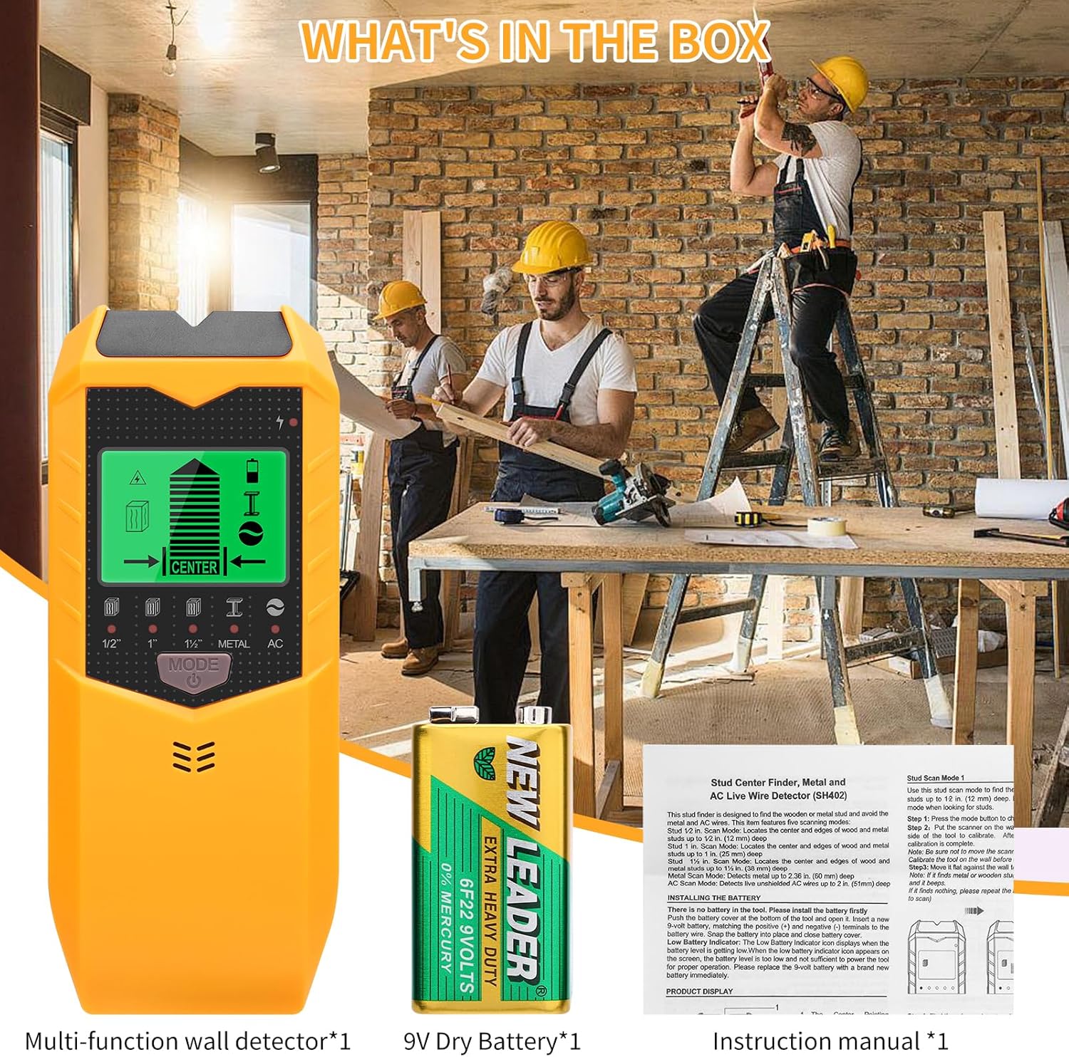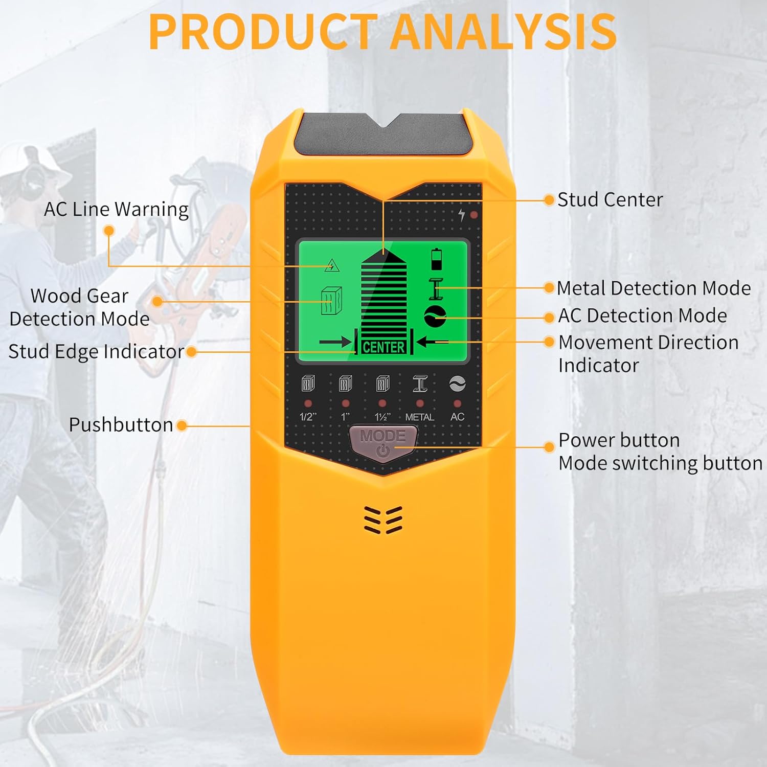MULTIPLE FUNCTIONS: Wall stud scanner is used to detect wood stalk center position, metal position and live wires in wood and drywall type walls with AC warning function