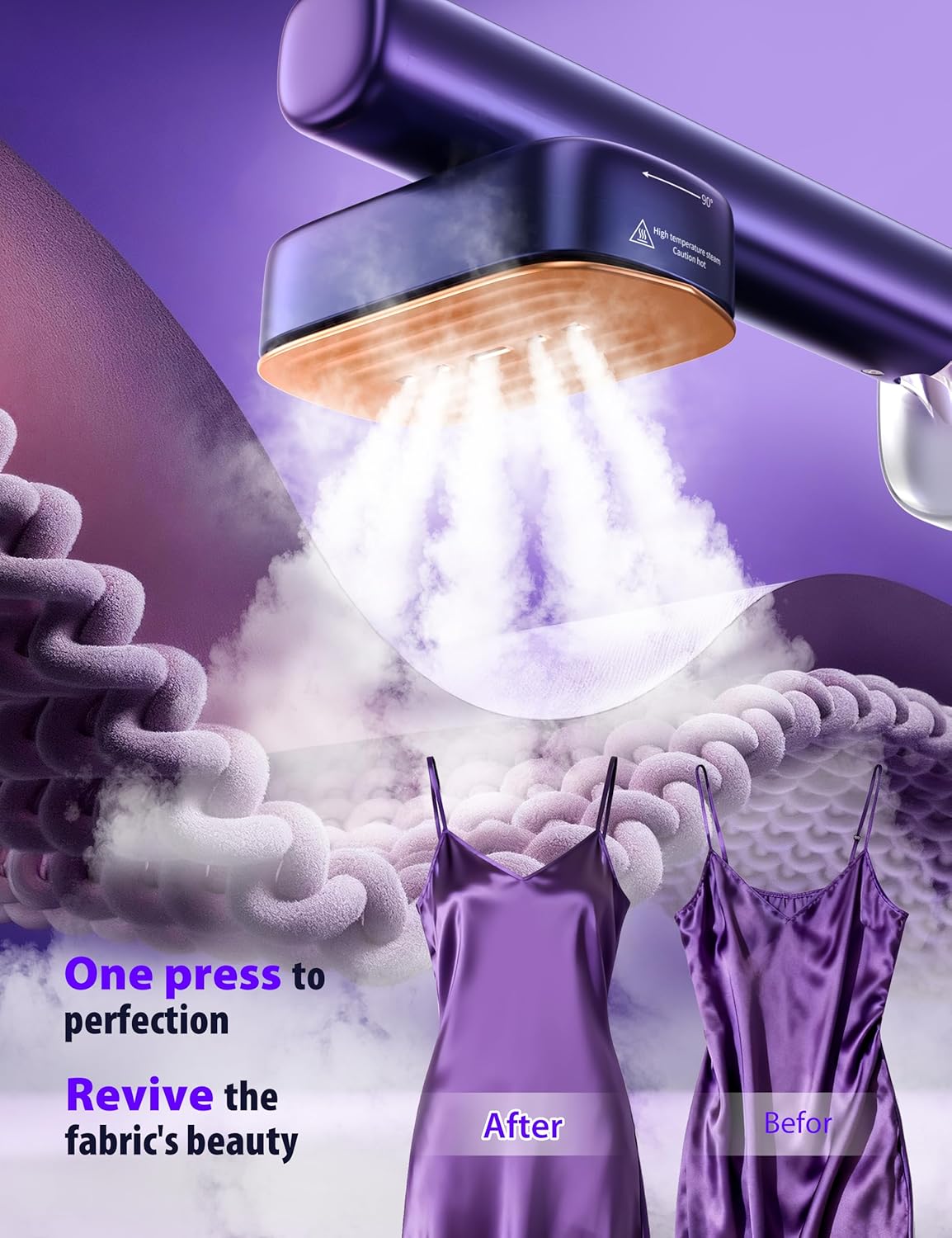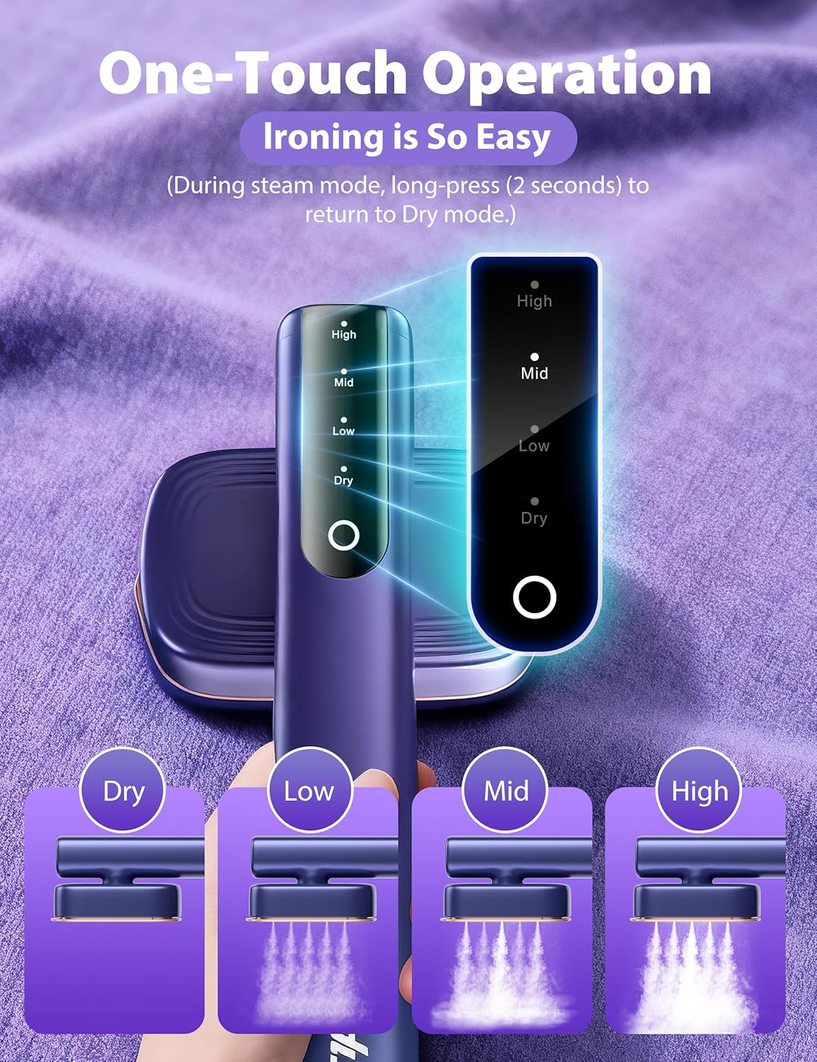 【Touch Control · Three Steam Settings】Touch buttons effortlessly adjust three steam intensity levels for continuous, efficient steam output that quickly removes wrinkles. Customize steam strength for different fabrics—ideal for eliminating creases in silk, lace, tulle, cotton, linen, nylon, denim, wool, and more—saving ironing time.