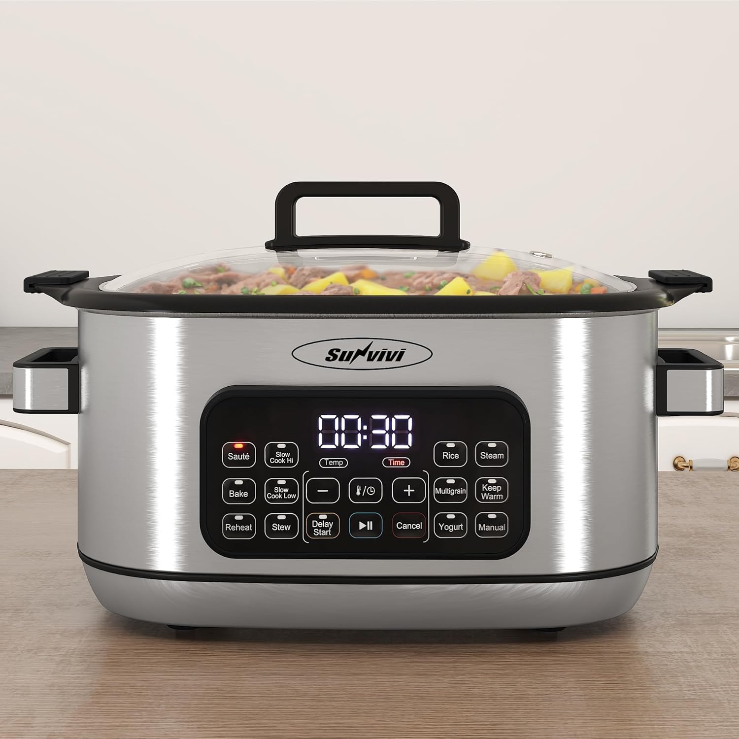 Sunvivi 12-in-1 Multi Slow Cooker Roaster Oven, 6.5QT Sliver Digital Programmable Slow Cooker with Rack, Large Removable Nonstick Crock, Glass Lid, Multicooker with Timer Temp Control, Delay Start
