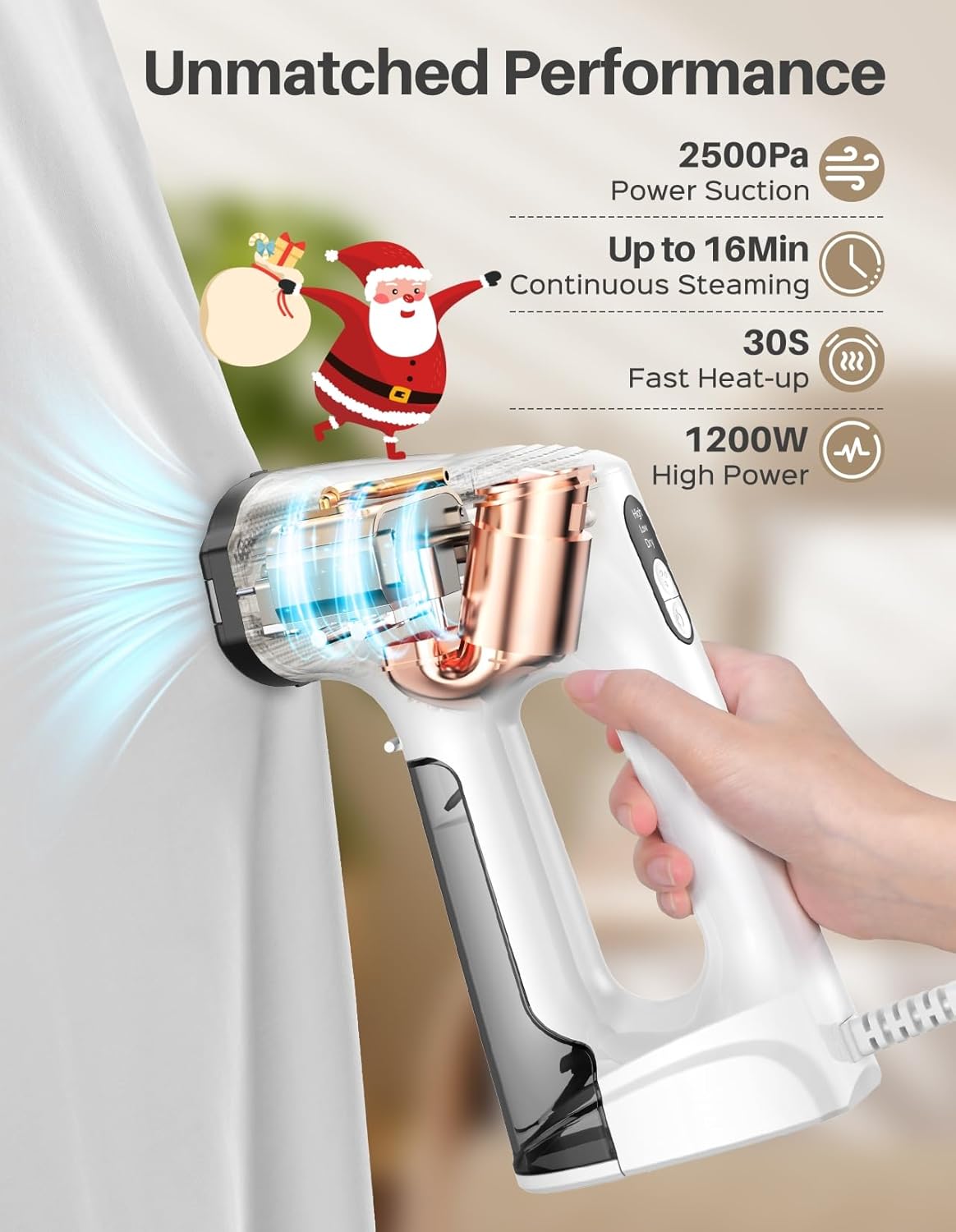 Wrinkle-Blasting Power in Just 30 Seconds: Rushing out the door? No problem. Our 1200W heating system delivers a powerful burst of steam in half a minute. This intense steam penetrates deep into fabric fibers, rapidly relaxing and erasing even the most set-in wrinkles from last season’s storage. Achieve a crisp, freshly-pressed look in record time with this powerful vacuum steamer for clothes, turning a chore into a quick, satisfying task.