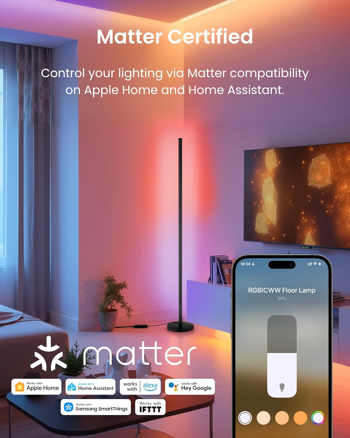 Floor Lamp with Matter: The SwitchBot Floor Lamp supports Matter, letting you control it with voice commands via Apple Home, Alexa, Google Assistant, and more (no hub needed). A perfect choice for smart home enthusiasts and modern families — create a cozy Christmas / holiday atmosphere with warm white lighting. You can also control the lamp using the SwitchBot app.