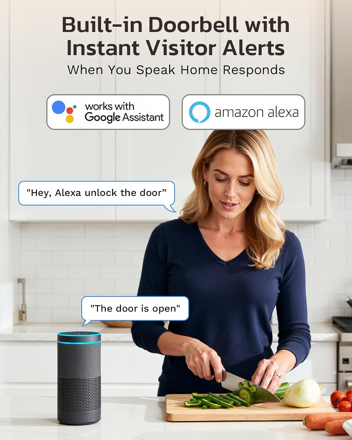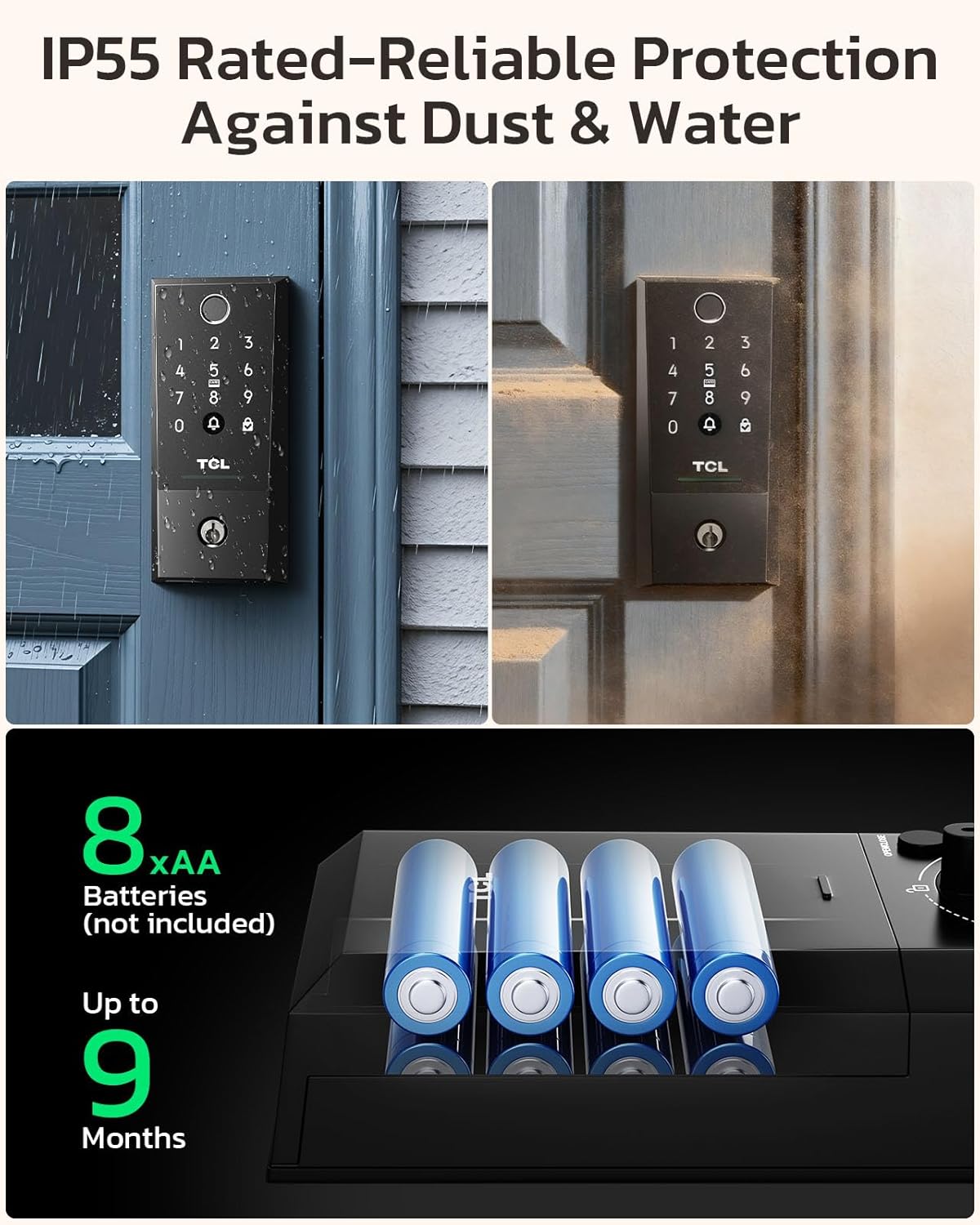 IP55 Weatherproof & Voice Control: Designed with an IP56 rating to reliably perform in rain, dust, and varying temperatures. The built-in doorbell seamlessly works with Alexa and Google Assistant for hands-free convenience, allowing you to lock the door or check its status using your voice.