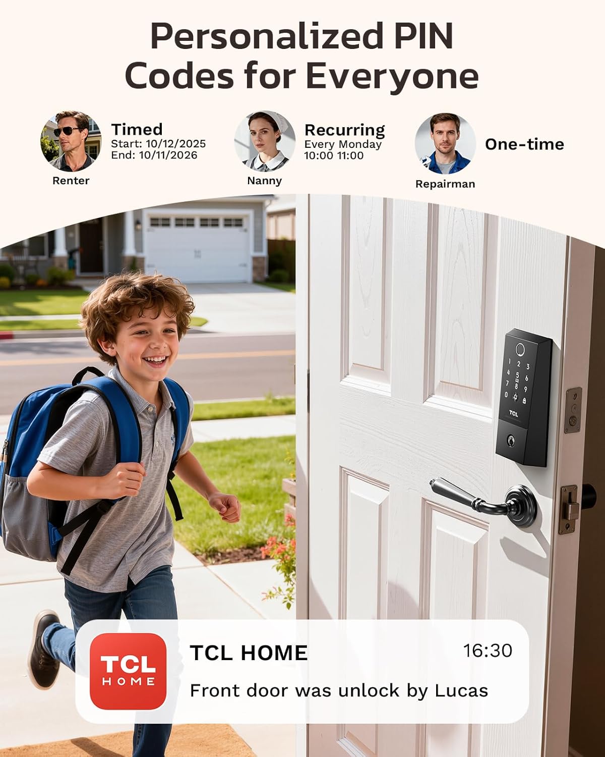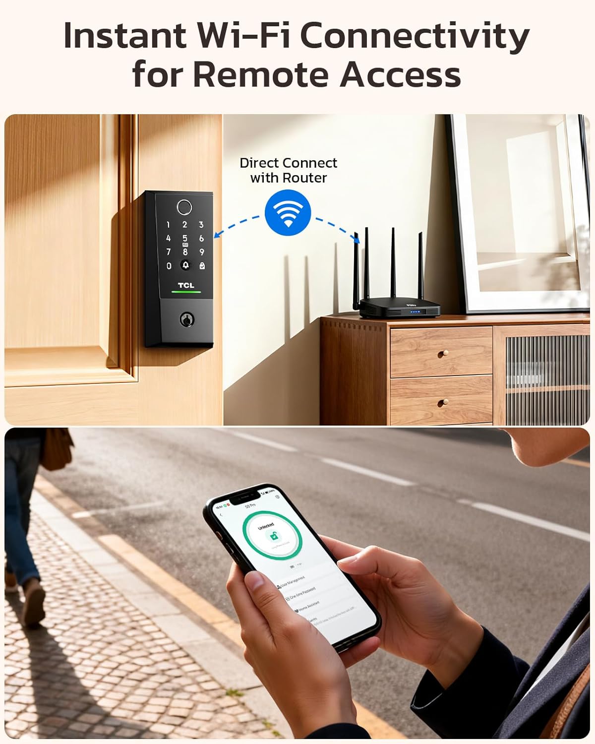 Hub-Free Wi-Fi with TCL Home App: Connect directly to your home Wi-Fi without the need for a separate hub. Use the TCL Home app for remote access and control, and receive instant notifications for all access events and doorbell rings, no matter where you are.