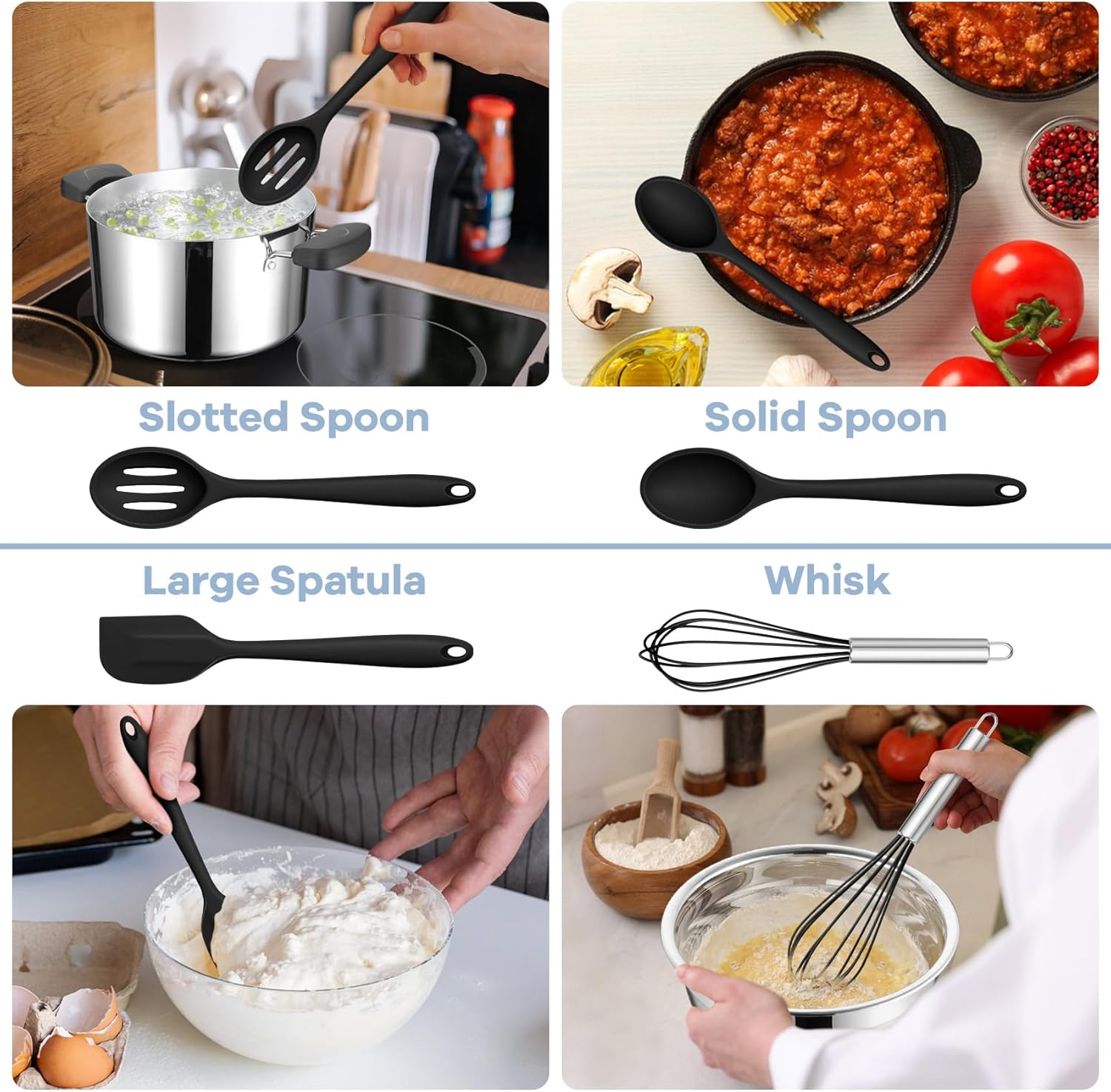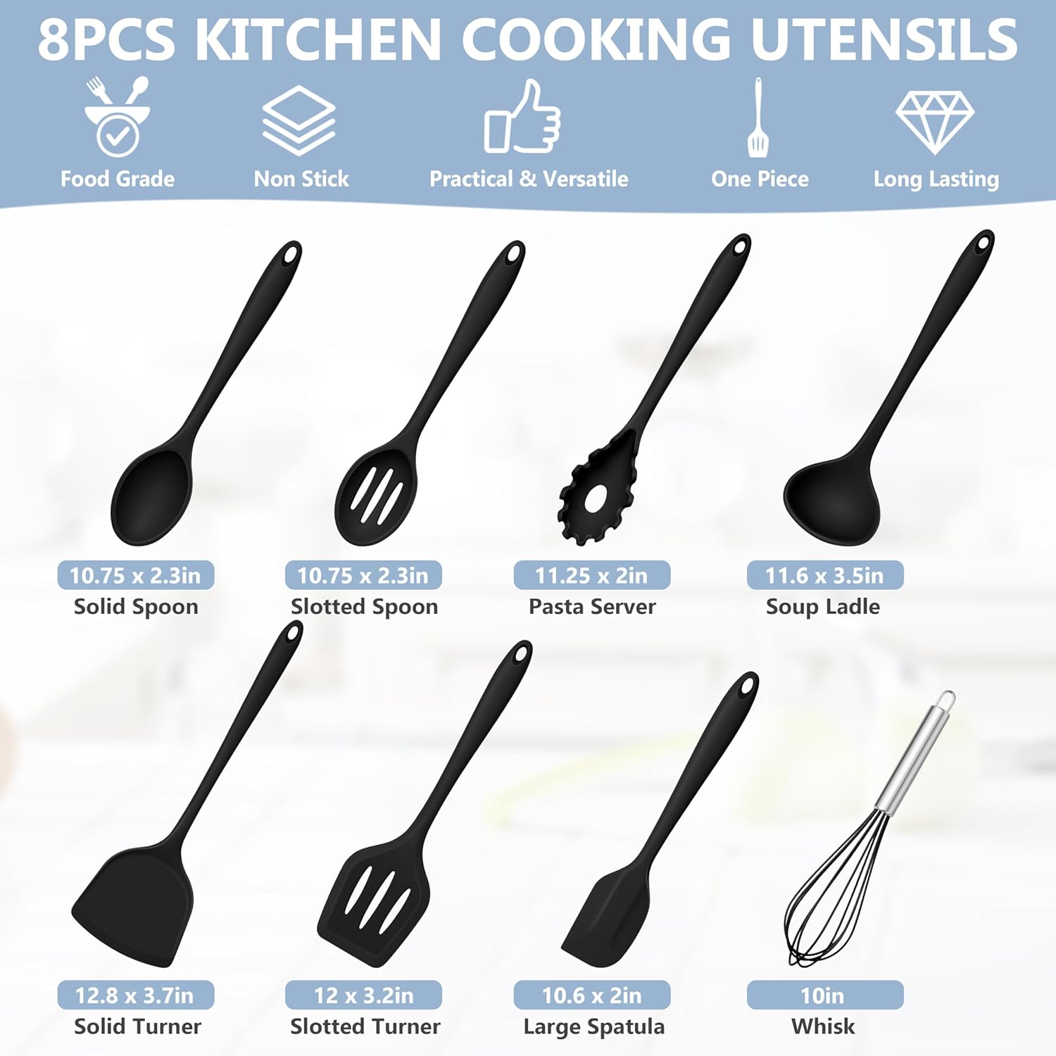 GREAT KITCHENWARE SET – This silicone cooking utensils set includes 1 x slotted turner, 1 x solid turner, 1 x slotted spoon, 1 x solid spoon, 1 x pasta server, 1 x soup ladle, 1 x large spatula and 1 x whisk, A great addition meets your versatile kitchen tasks from cooking pasta, vegetables to cakes baking preparation and meal serving, Good choice for cooking enthusiasts on festivals