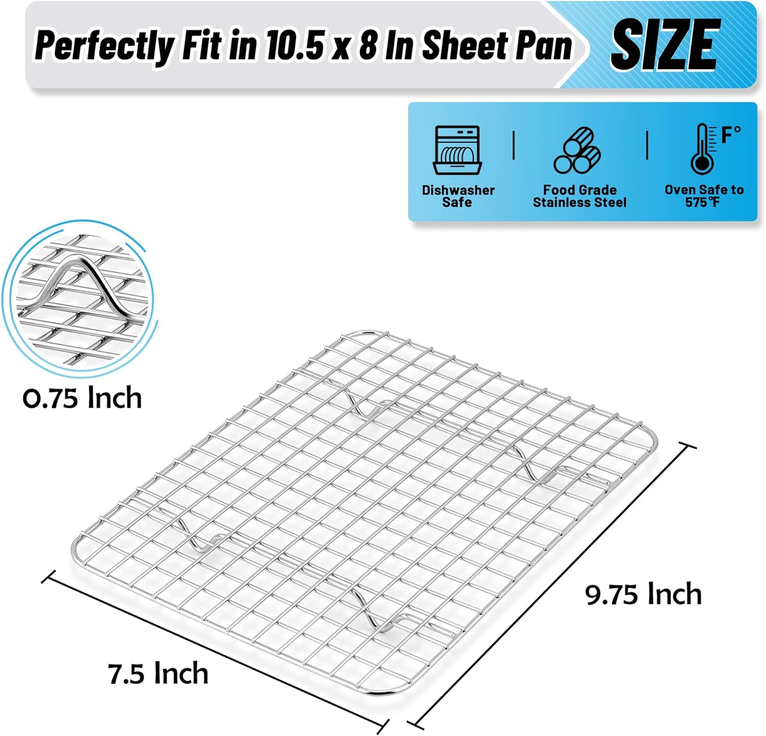 Multi-Use: Roasting rack set of 2 are measuring 9.75’’ x 7.5’’x 0.75’’, Compact size for small amount of 1-2 person’s needs, Ideal for baking and cooling cookies, Roasting shrimp, Grilling and Smoking bacons / kabobs, Decorating donuts, Dripping grease, An economical choice for daily use