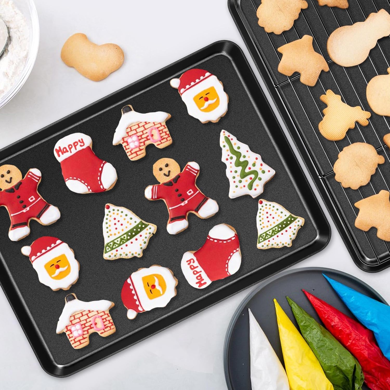 4 Pieces Bakeware Set: Including 2 toaster oven pans and 2 cooling racks, Fits most regular / small ovens, work together and also can apart, nice for baking cookies, vegetables, cakes, chicken, etc.