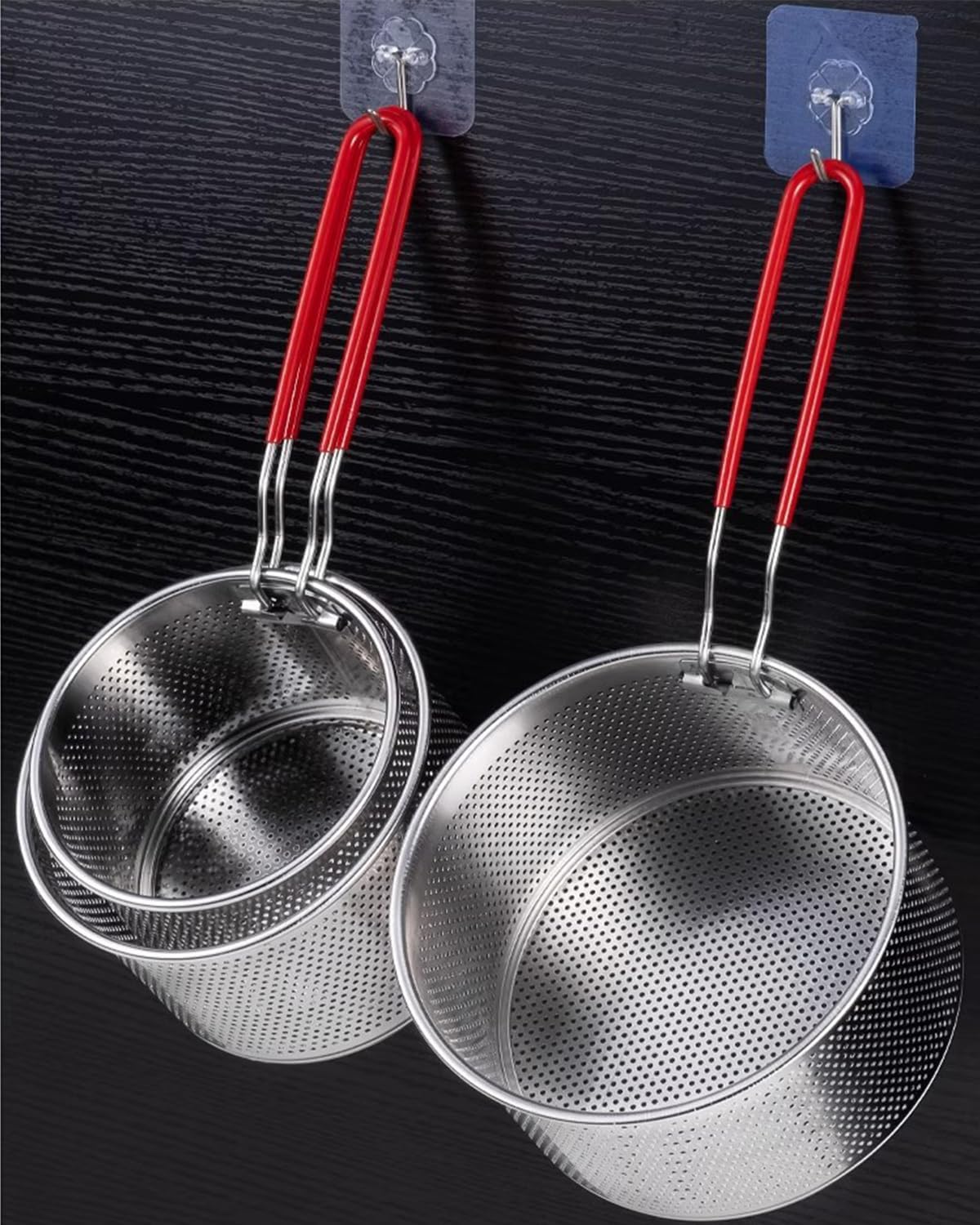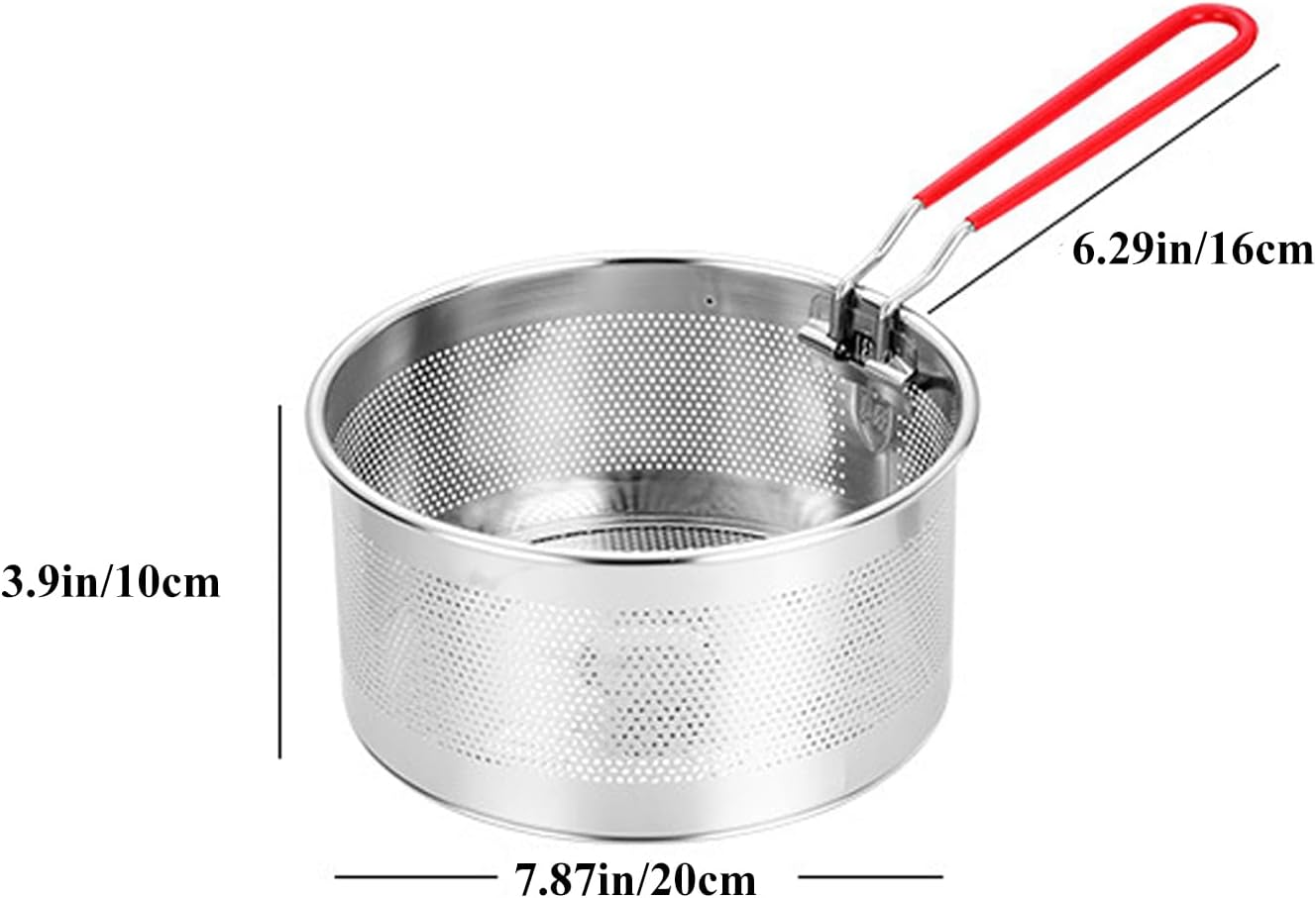 [Portion Control]: This large strainer basket with handle can accommodate up to 3.3 Quart of pasta for Asian or Italian dishes, such as ramen, pho, or spaghetti enough to feed up to 2 people; Great for deep frying.