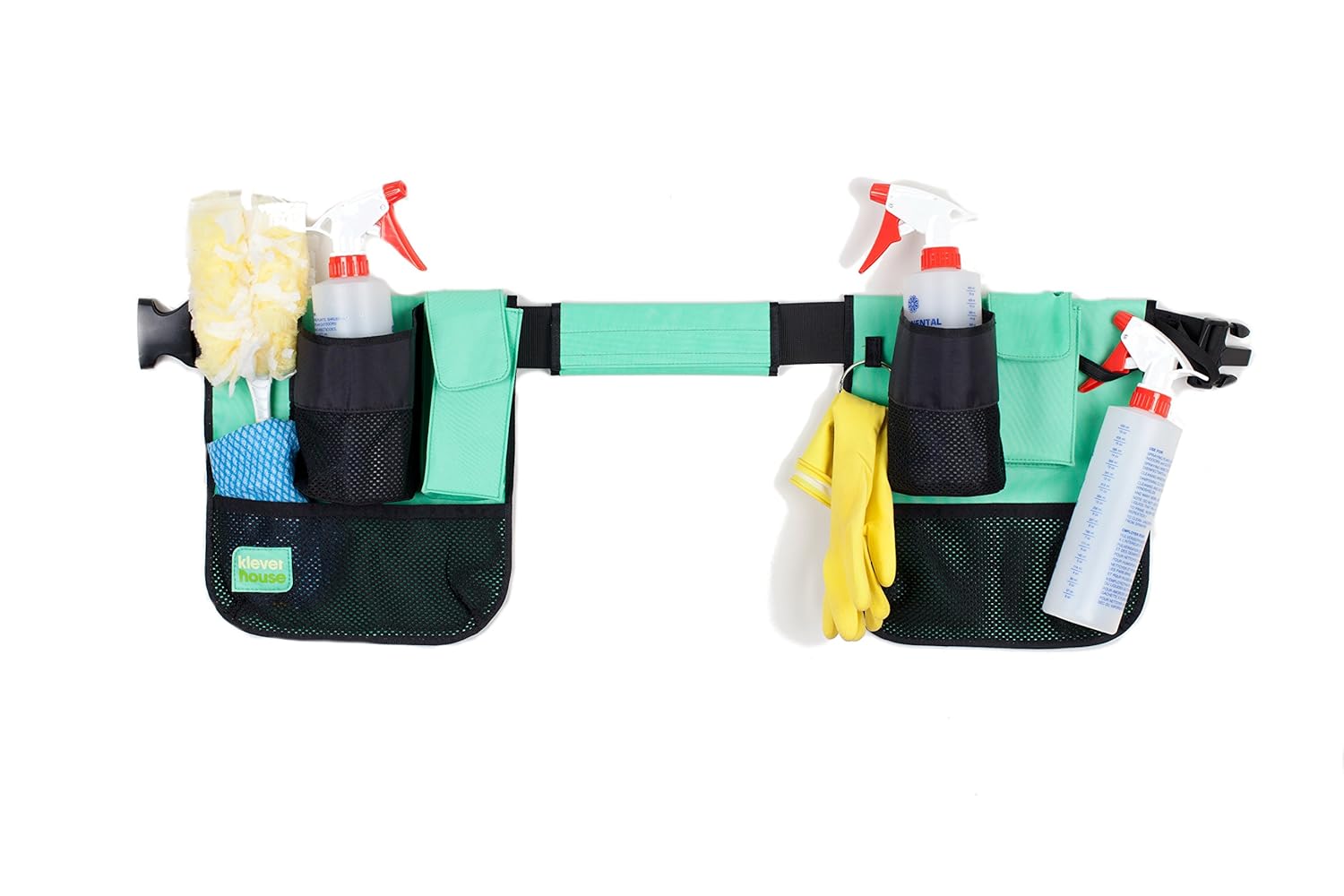-Nylon waterproof material -Padded for comfort and support -Adjustable 2″ belt fits 27″ to 48″ waist -Used by thousands of Businesses and House Cleaners -A Phone pocket -Elastic paper towel holder -Secure organized and within reach -Hands-free cleaning product hold