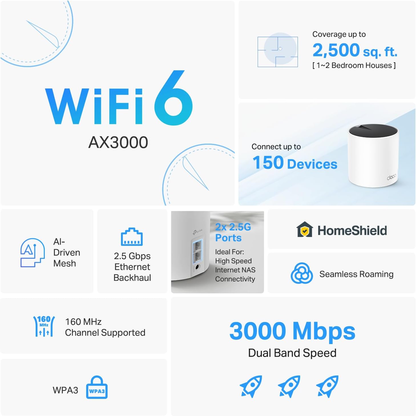 TP-Link Deco X55 Pro AX3000 Whole Home Wi-Fi 6 Mesh System – Coverage up to 2500 Sq.Ft & up to 150 Devices, 2×2.5G WAN/LAN Ports, 4 Streams, Ethernet Backhaul, Ideal for 1Gig+ Internet, 1-Pack