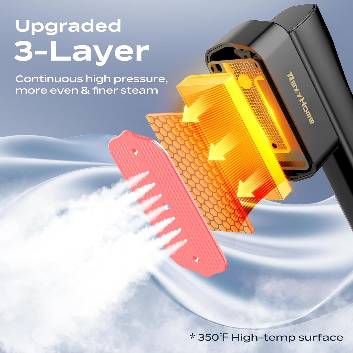 Upgraded 3-Layer Structure: More even and finer steam, this design significantly enhances both steaming performance and water efficiency. It extends the garment steamer working time while delivering powerful, fabric-safe wrinkle removal, leaving your clothes looking perfectly refreshed