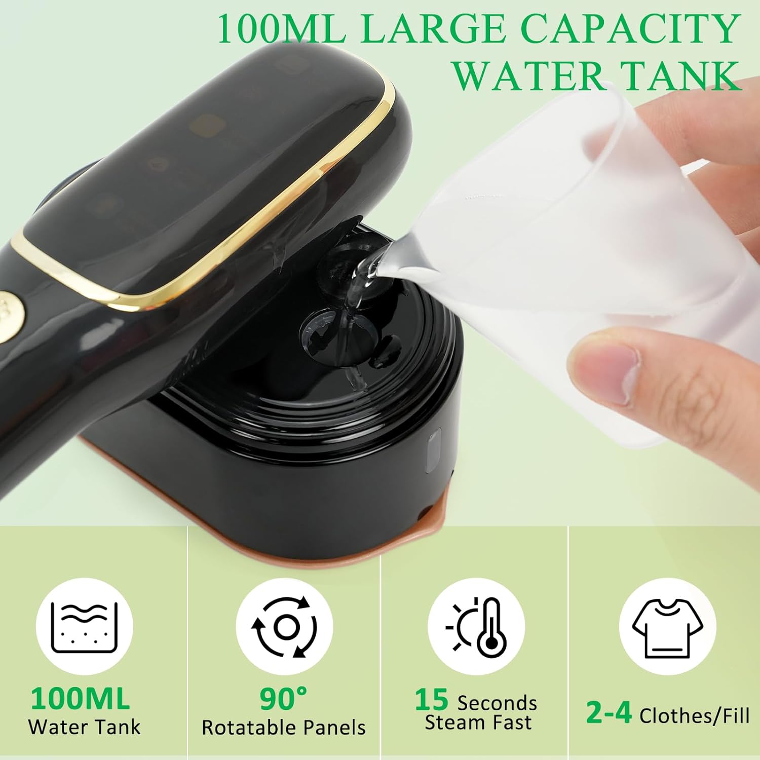 Fast & Powerful Steaming – Equipped with 1200W high power, this handheld garment steamer heats up in just 15 seconds and delivers continuous, powerful steam to quickly remove wrinkles from clothes, curtains, and more. Excellent heating speed and excellent wrinkle removal ability make it ideal for fast and efficient garment care. The portable steamer iron with 100ml large water tank ensures longer steaming sessions without frequent refills.
