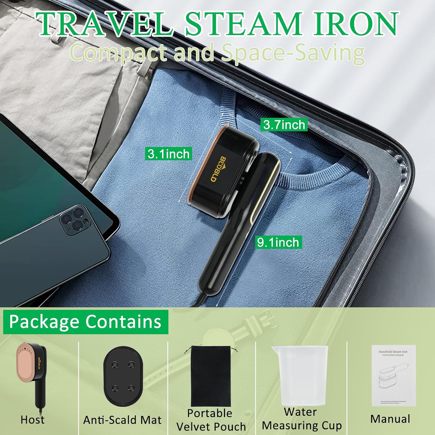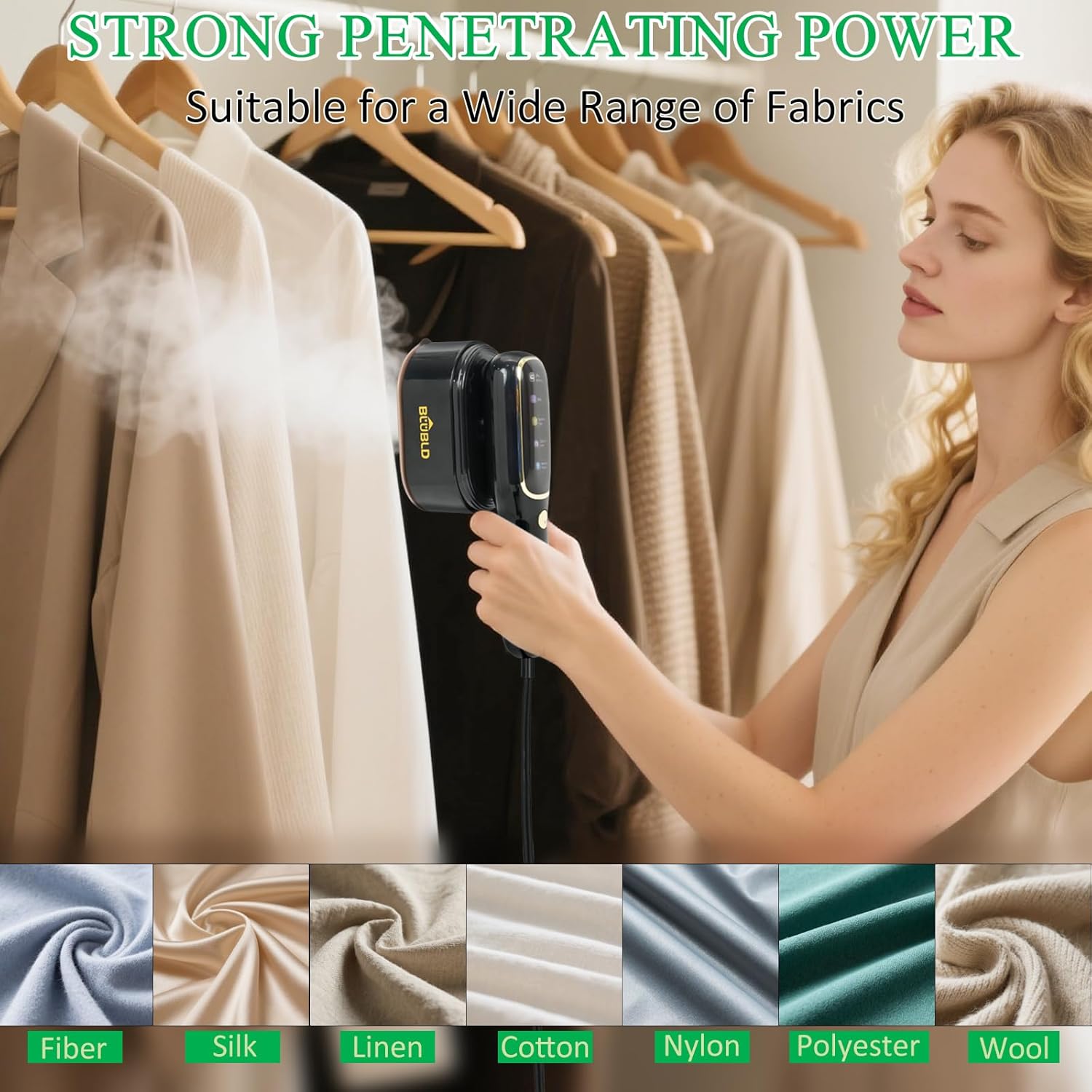 Ergonomic & Portable Design – This 90° rotatable handle and lightweight body (1.81 lb) make it easy to use in any angle, whether hanging or flat ironing. Perfect for travel, with a compact size ( 8.46 × 3.94 × 3.15 in) and included heat-resistant base. This travel steamer with a velvet bag for easy packing, approved for carry-on luggage.