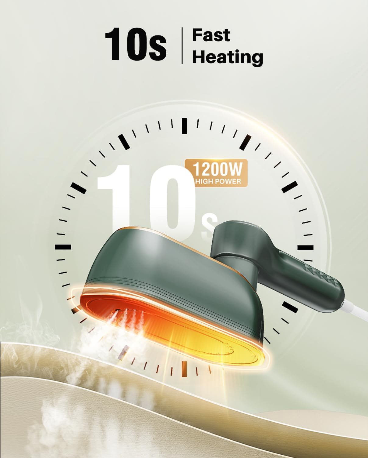 10s Fast Heating: The 1200W high power garment steam iron heats up instantly in less than 10 seconds to achieve a 320°F constant ironing temperature, making ironing a breeze with its fast heating and powerful steam output. The delicate steam has strong penetrating power and can effectively deep soften the fibers of your clothes and remove all kinds of stubborn creases.