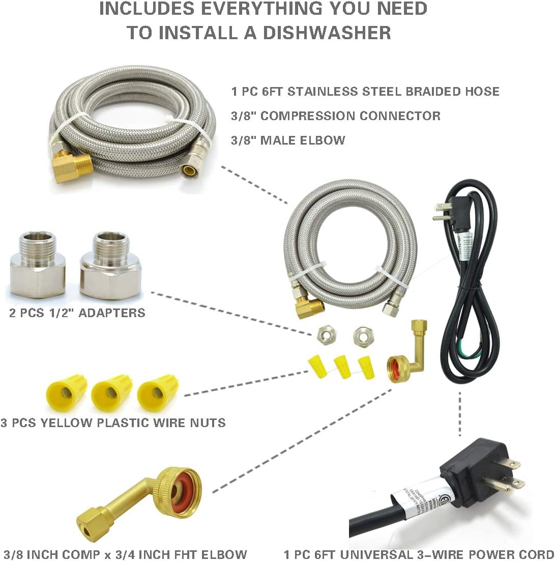 COMPLETE INSTALLATION KIT – Our dishwasher install kit universal includes 1pc 6 ft stainless steel dishwasher supply line with 3/8″ Comp x 3/8″ Comp connections,1pc 3/8 in MIP elbow connector adapter,1pc 3/8″ Comp x 3/4 in FHT elbow,3pcs yellow plastic wire nuts,2pcs 1/2″ adapters and 1pc universal 3-wire power cord.