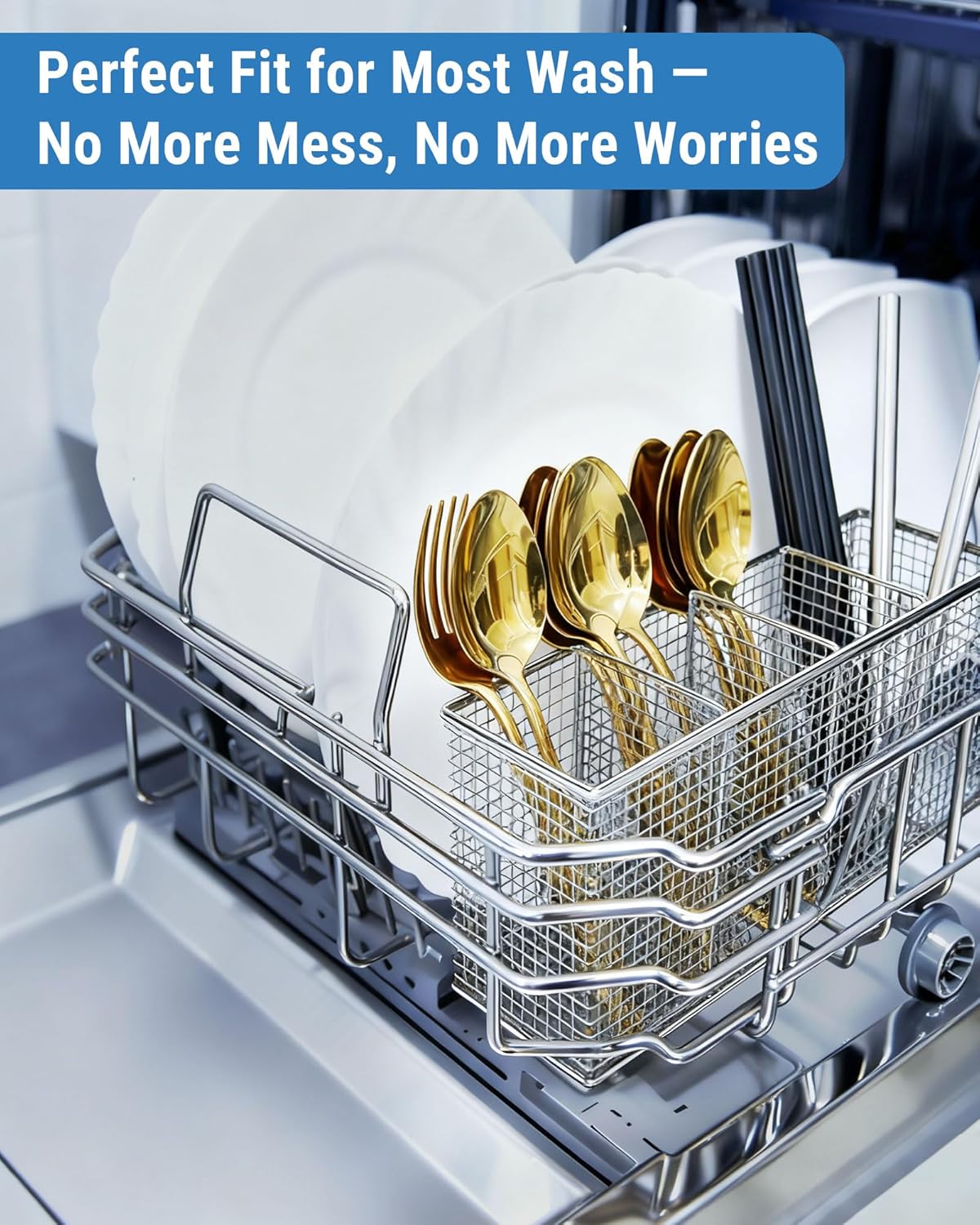 【Premium 304 Stainless Steel】This extra dishwasher silverware basket’s fine mesh bottom is expertly designed to prevent utensil tips from falling through—a major upgrade. Made of food-grade 304 stainless steel, this silverware holder for dishwasher is exceptionally sturdy and durable, and naturally anti-rust. Plus, the double-layered smooth rim ensures safe handling and protects your hands.