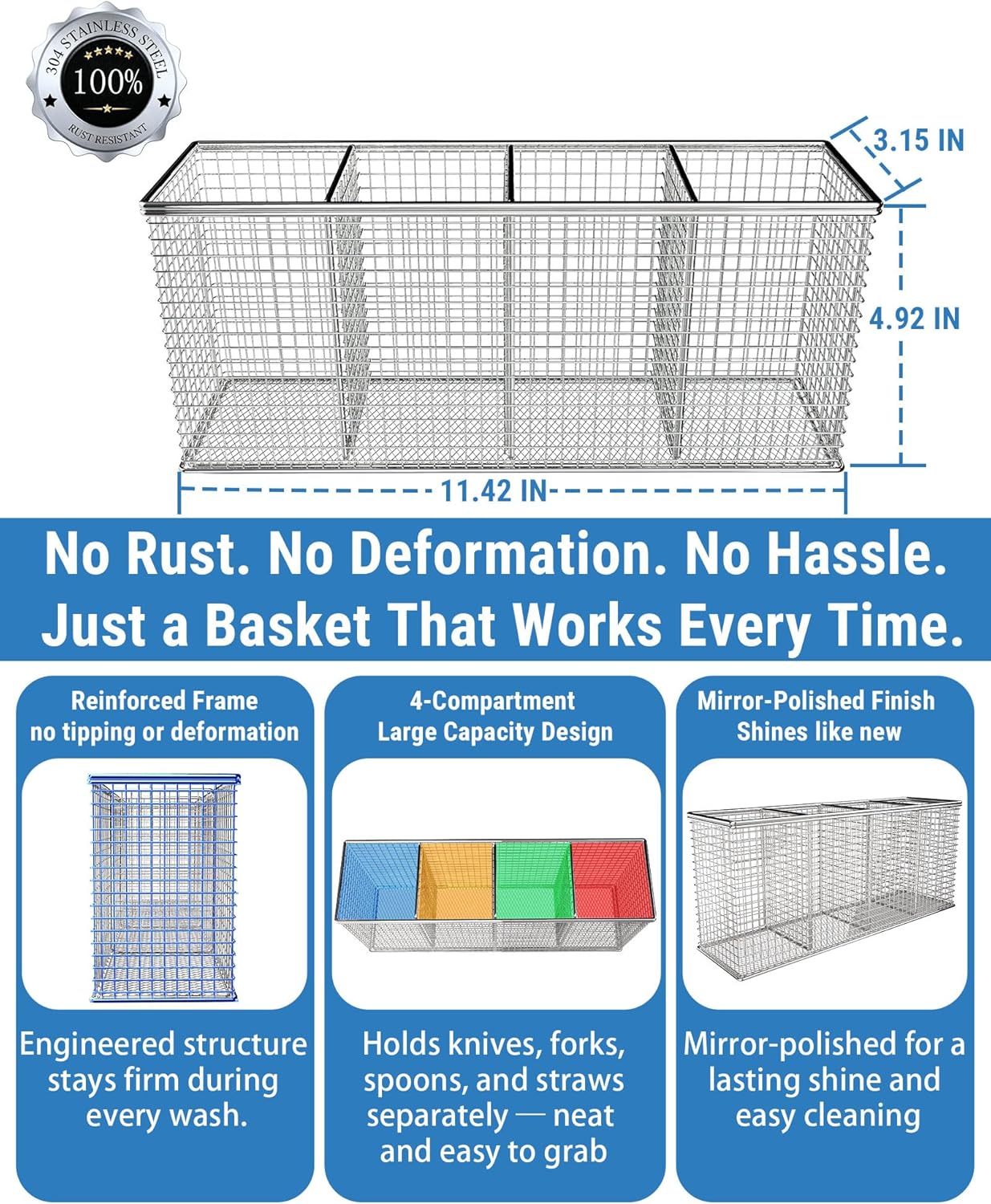 Upgrade your dishwasher storage with this premium dishwasher silverware basket—a universal 4-slot design that keeps forks, knives, spoons, and chopsticks neatly organized. Measuring 11.42″ x 3.15″ x 4.92″, this dishwasher basket is a single, spacious unit designed for maximum capacity. Before purchase, please measure your lower rack to ensure the right fit.