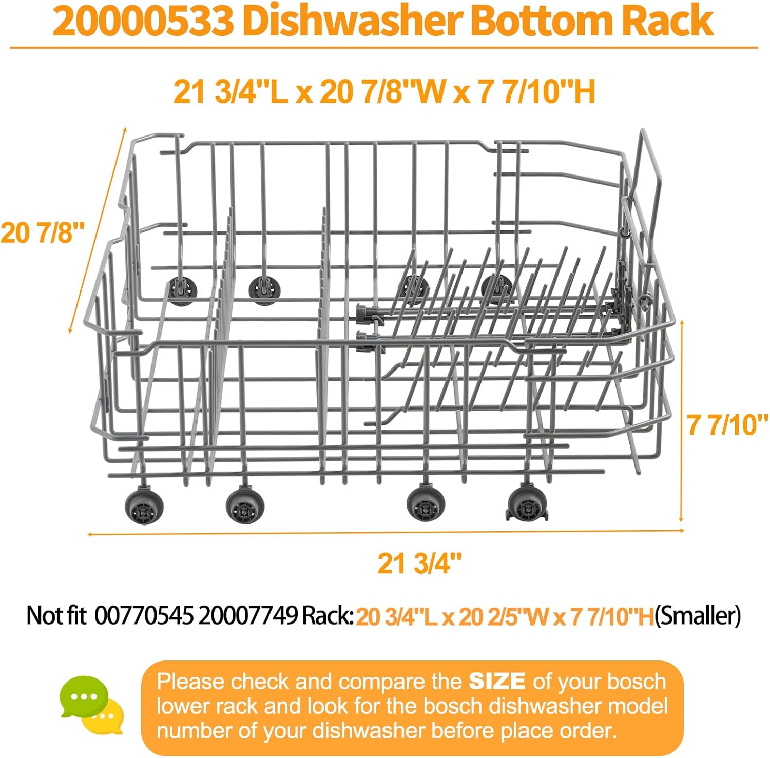 SIZE: 21 3/4″L x 20 7/8″W x 7 7/10″H (Big)Please check the size, part number or model before orderingNot fit: 00770545 20007749 Dishwasher Lower Rack 20 3/4″L x 20 1/2″W x 7 7/10″H(smaller)
