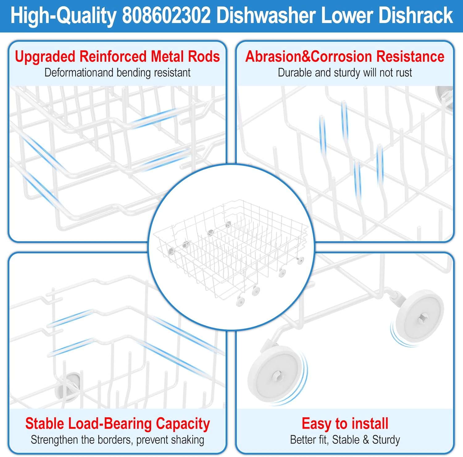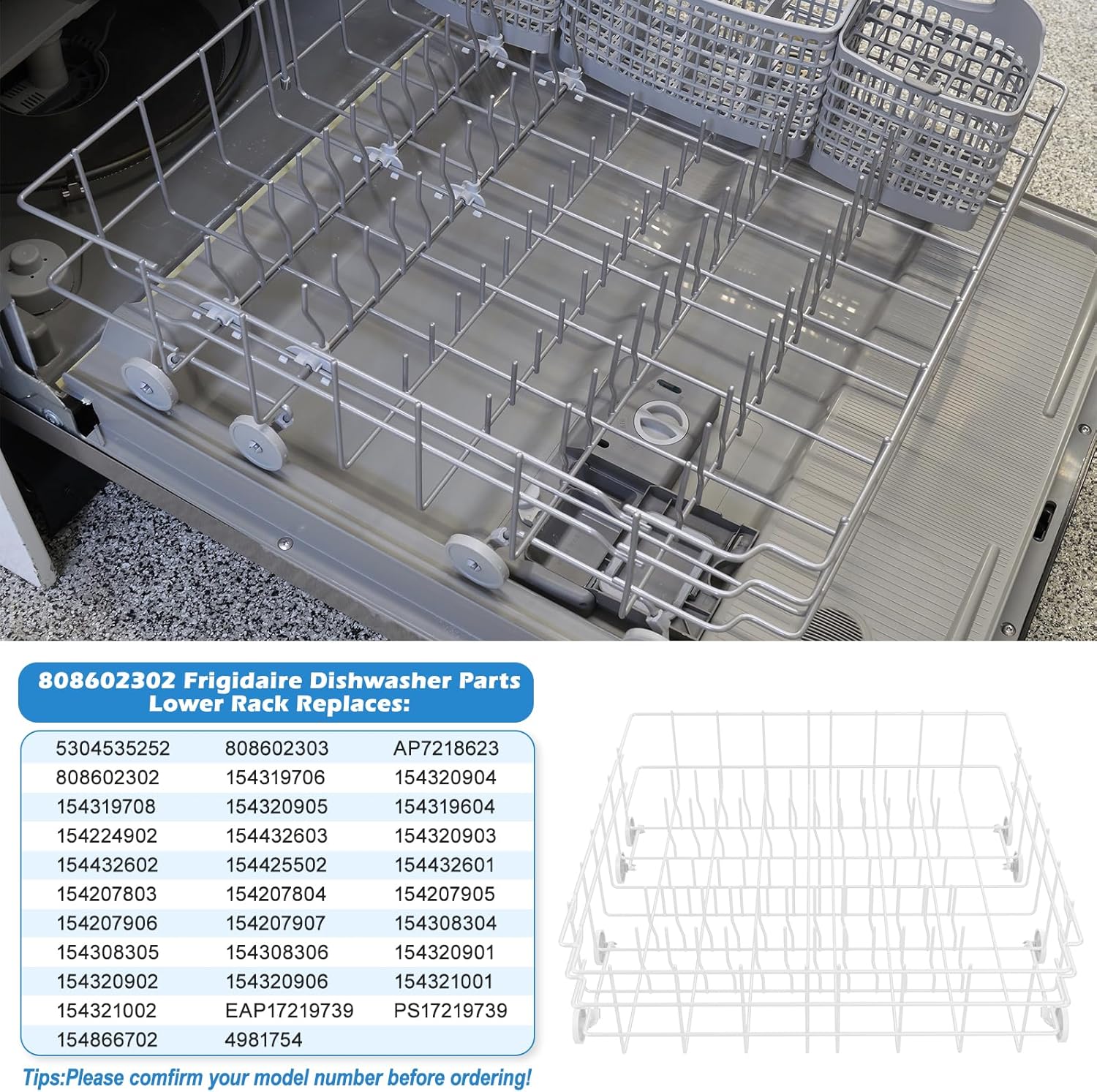 【Excellent After-sale Support】12 months worry-free warranty. No risk shopping. Buy with confidence. If this 808602302 dishwasher parts rack you receive are found any problems within 12 months, please send us an email, we will definitely give you a satisfactory solution. Package Contents: 1×808602302 dishwasher lower rack replacement and 8 × 154174501 dishrack wheels & bracket assembly.