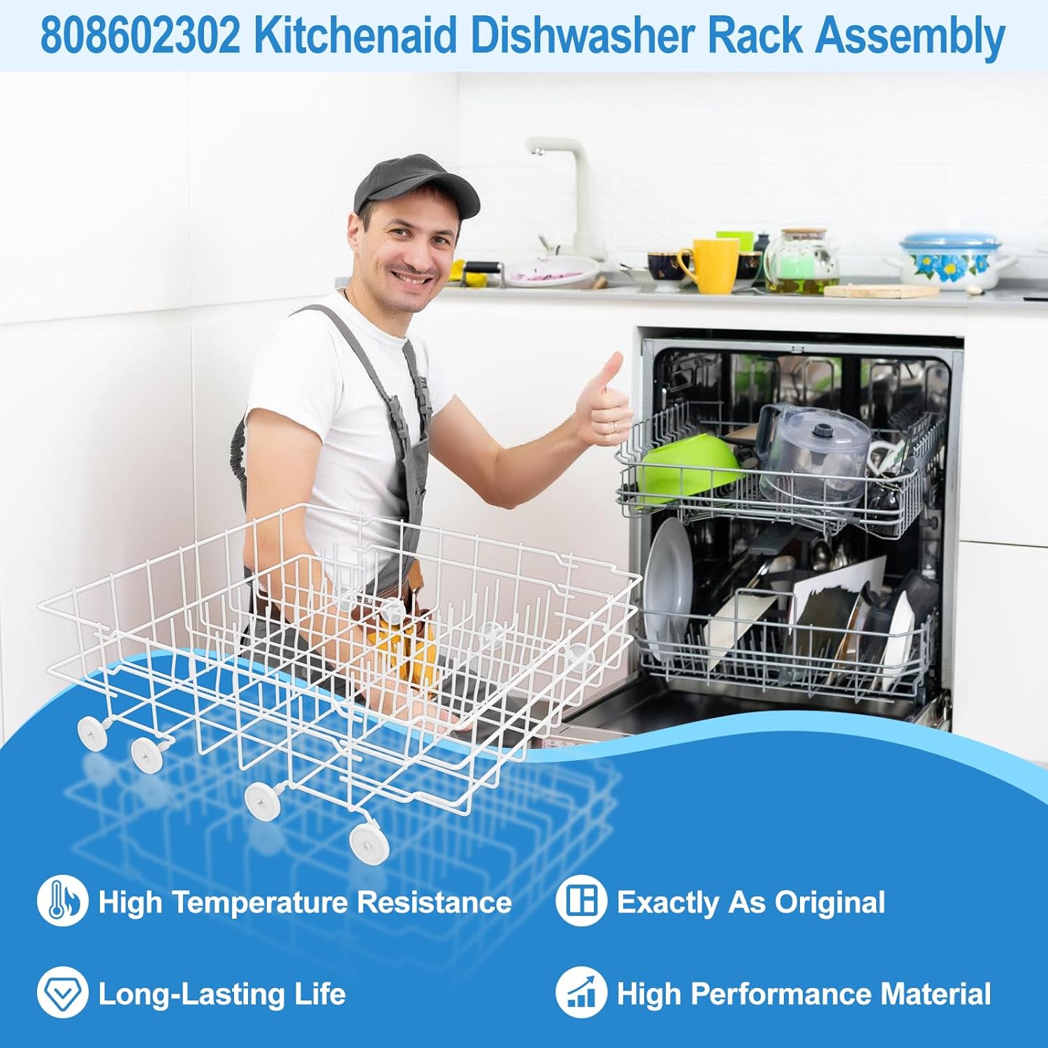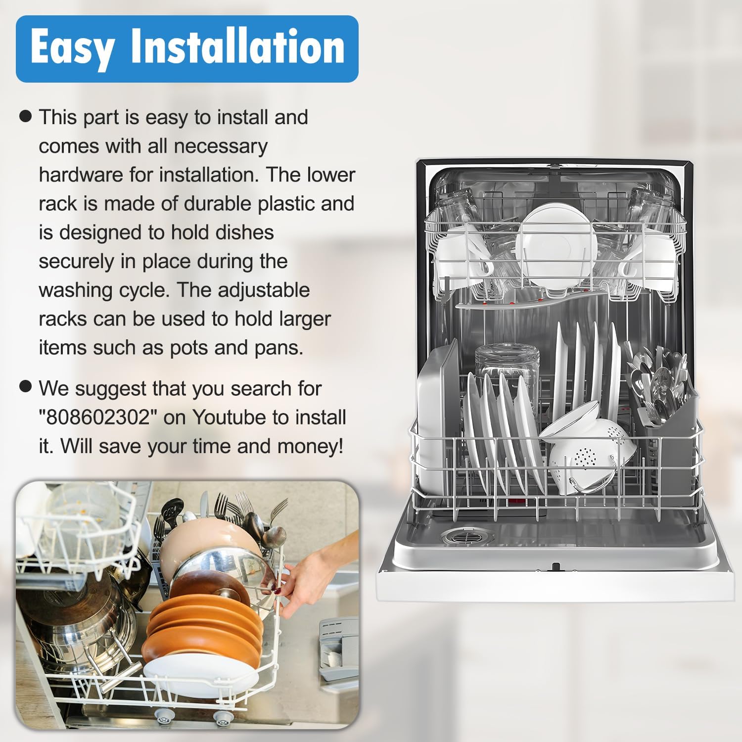 【Excellent Dishwasher Dishrack-Perfect Solution】808602302 dishwasher lower rack mainly repair the following symptoms: 1. The coating on the dishrack peeled off and fell apart. 2. Dishrack Crack and rust,causing damage to tableware. 3. Dishrack is broken or deformed. 4. Stains on dishrack are not easy to remove.808602302 kenmore dishwasher rack parts is easy to install, If you in doubt on installation, please search for “808602302 ” on YouTube, you can find step by step video instructions online. It can save your time and money!
