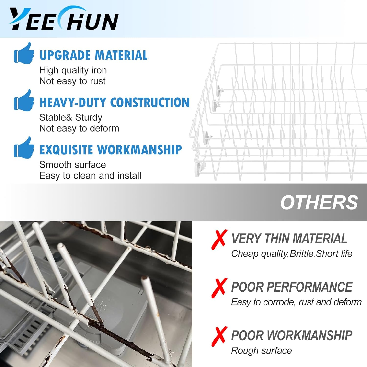 【Dishwasher Rack Upgraded Coating Process 】808602302 Dishwasher Rack utilizes a nylon dip coating process to form a uniform, continuous film on the surface, effectively isolating air and moisture to prevent corrosion and extend the lifespan of dishrack. The coating has high hardness, can resist friction and scratches in daily use, is not easy to break and bend under high temperature environment, and has high rust resistance.