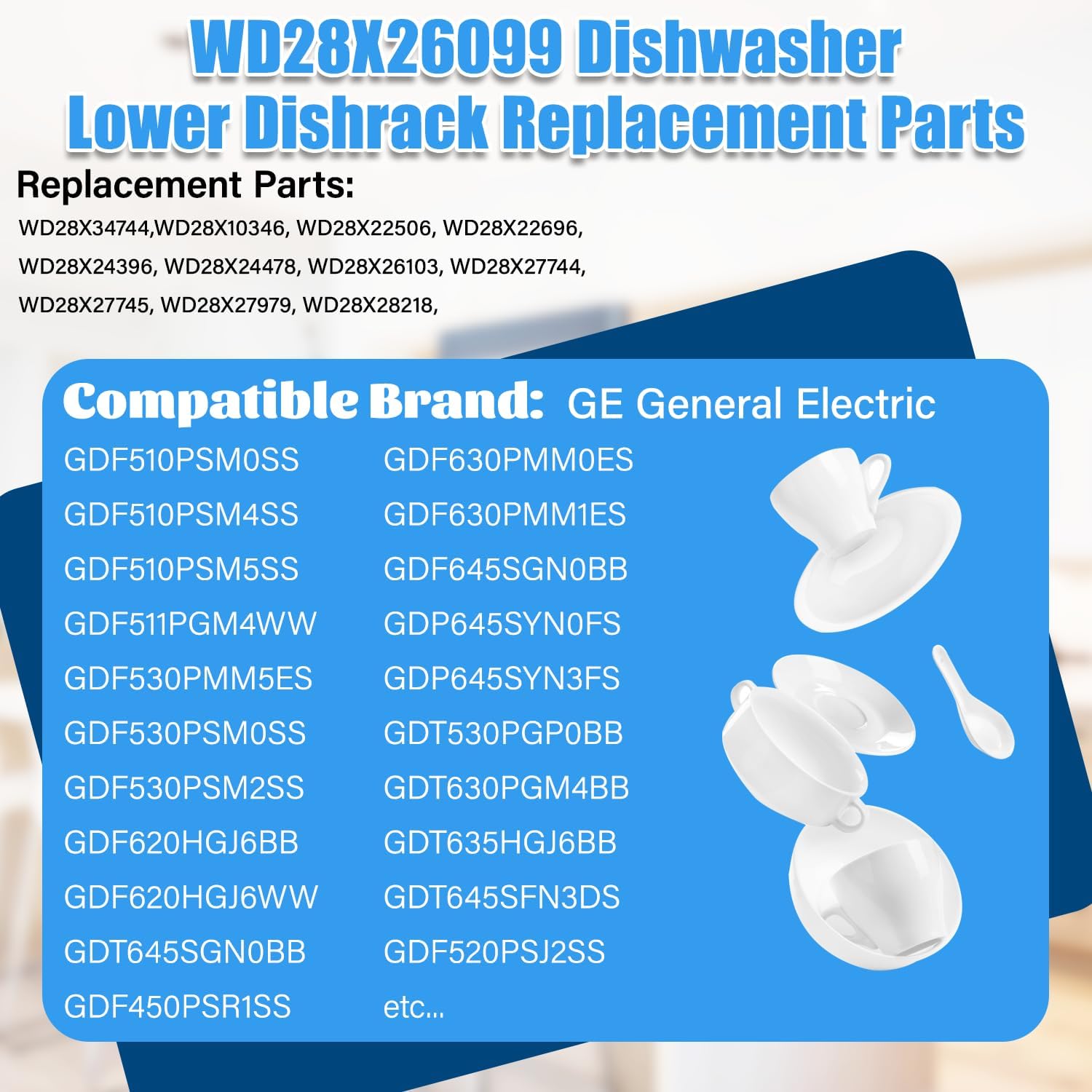 【Excellent After-sale Support】12 months worry-free warranty. No risk shopping. Buy with confidence. If this WD28X26099 dishwasher parts rack you receive are found any problems within 12 months, please send us an email, we will definitely give you a satisfactory solution. Package Contents: 1×wd28X26099 ge dishwasher lower rack replacement , 1× wd28x10128 dishwasher cutlery basket and 4× wd28x27241 dishwasher lower rack wheels carrier kit.