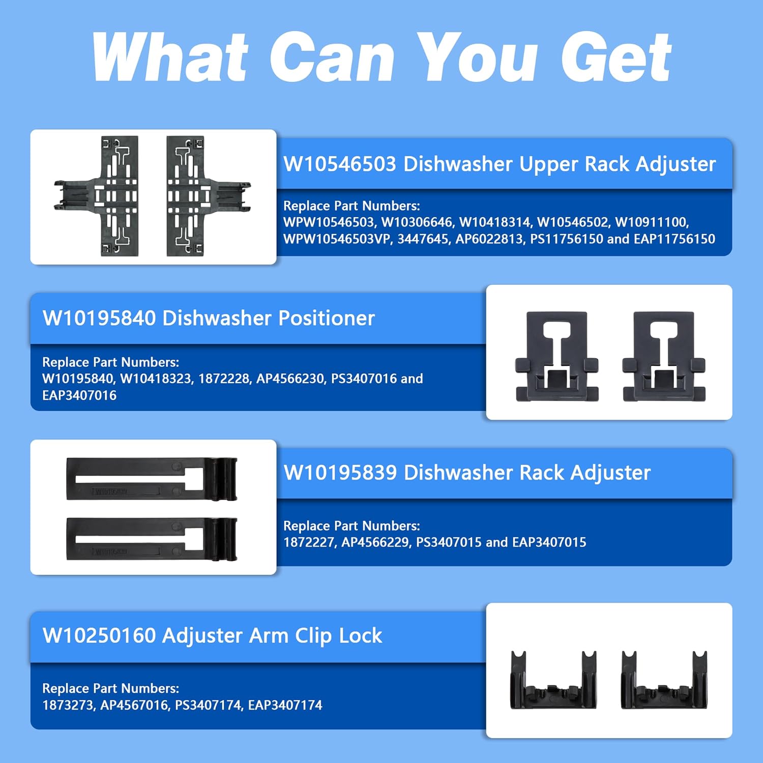 𝗗𝗶𝘀𝗵𝘄𝗮𝘀𝗵𝗲𝗿 𝗧𝗼𝗽 𝗥𝗮𝗰𝗸 𝗔𝗱𝗷𝘂𝘀𝘁𝗲𝗿 𝗣𝗲𝗿𝗳𝗲𝗰𝘁 𝗥𝗲𝗽𝗹𝗮𝗰𝗲𝗺𝗲𝗻𝘁 – ① W10546503 dishwasher upper rack adjuster replaces WPW10546503, W10418314, WPW10546503VP, AP6022813, W10306646, PS11756150, B008DJLRKW, B017TLV632. ② W10195840 dishwasher positioner replaces 1872228, AH3407016, EA3407016, PS3407016, WPW10195840, LP16233. ③ W10195839 dishwasher rack adjuster replaces WPW10195839, AP6016799, PS11750092. ④ W10250160 adjuster arm clip lock replaces WPW10250160, AP6017800, PS11751100