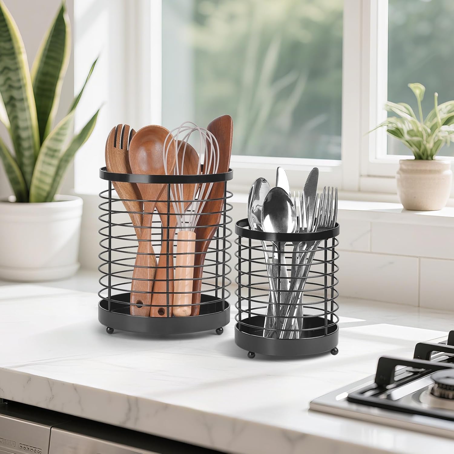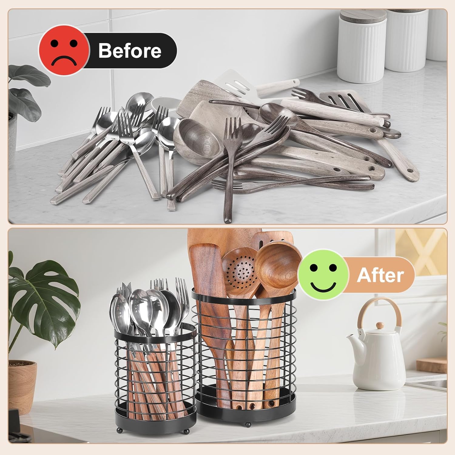 IWNTWY stainless steel kitchen utensil holder contains 2 sizes, you can place it on the kitchen countertop to store your large cooking utensils and small sized cutlery separately, convenient for storage and retrieval.