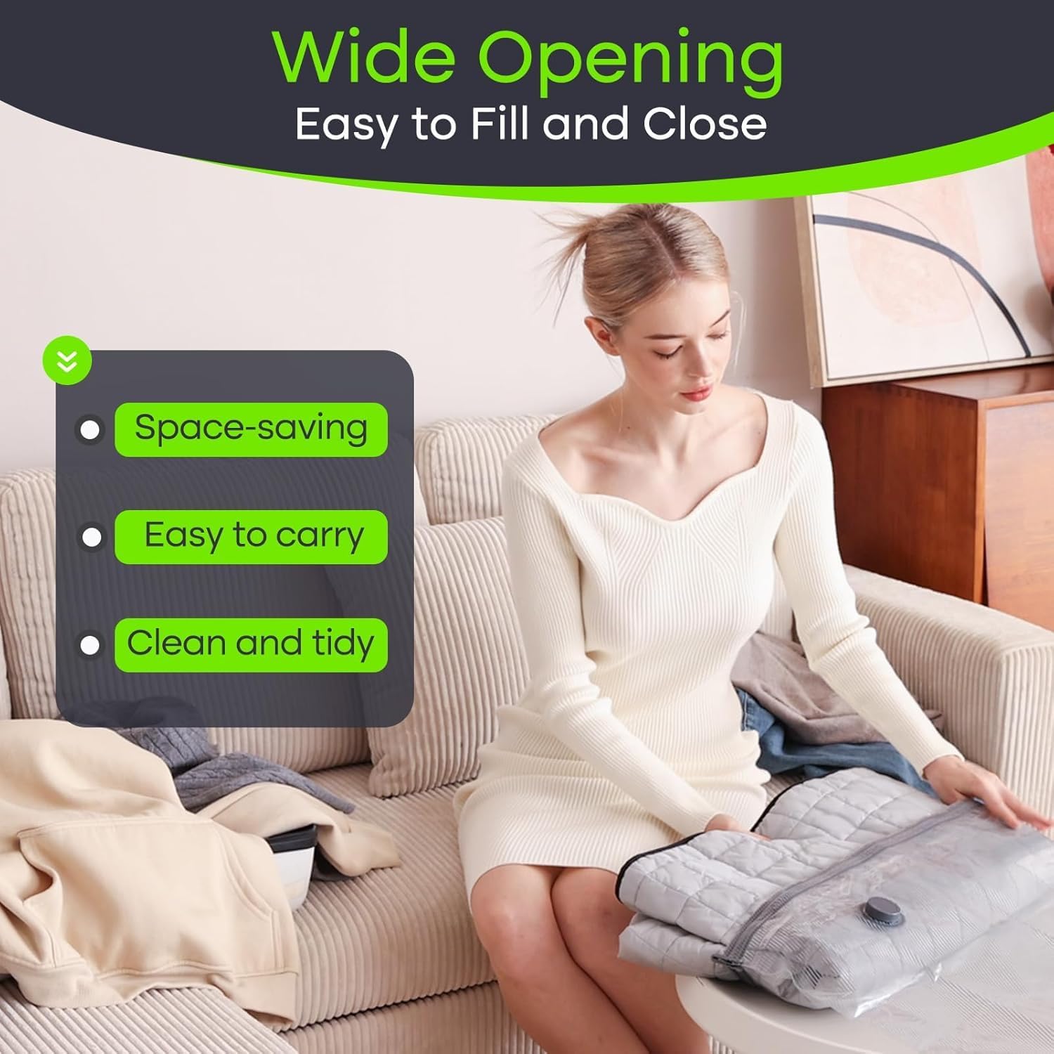 Multi-panel image of a white storage bag with ribbed texture. Features double zipper, tear-resistant material, and wide opening. Text highlights 5-layer structure and easy packing.Multi-panel image of a white storage bag with ribbed texture. Features double zipper, tear-resistant material, and wide opening. Text highlights 5-layer structure and easy packing.