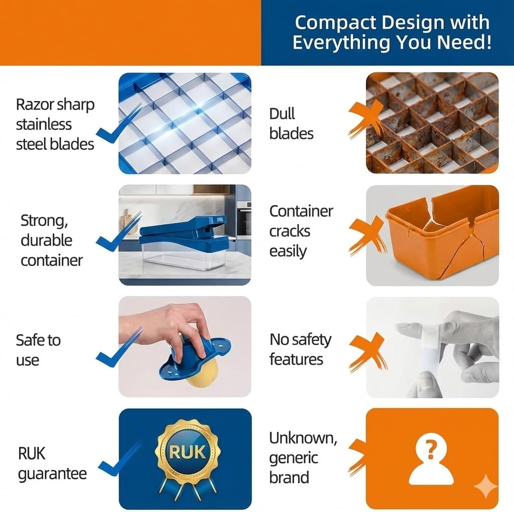 ⭐ 16-in-1 Multi-Function Chopper: Slice, dice, grate, julienne & shred with 16 interchangeable blades. ⭐ Razor-Sharp Steel Blades: Durable 420 stainless steel cuts tough veggies easily. ⭐ Built-In Storage Container: Keeps your prep area clean and organized. ⭐ Saves 80% Prep Time: Fast, consistent cuts for daily cooking or meal prep. ⭐ Safe & Easy to Clean: Non-slip base, hand guard & cleaning tools included