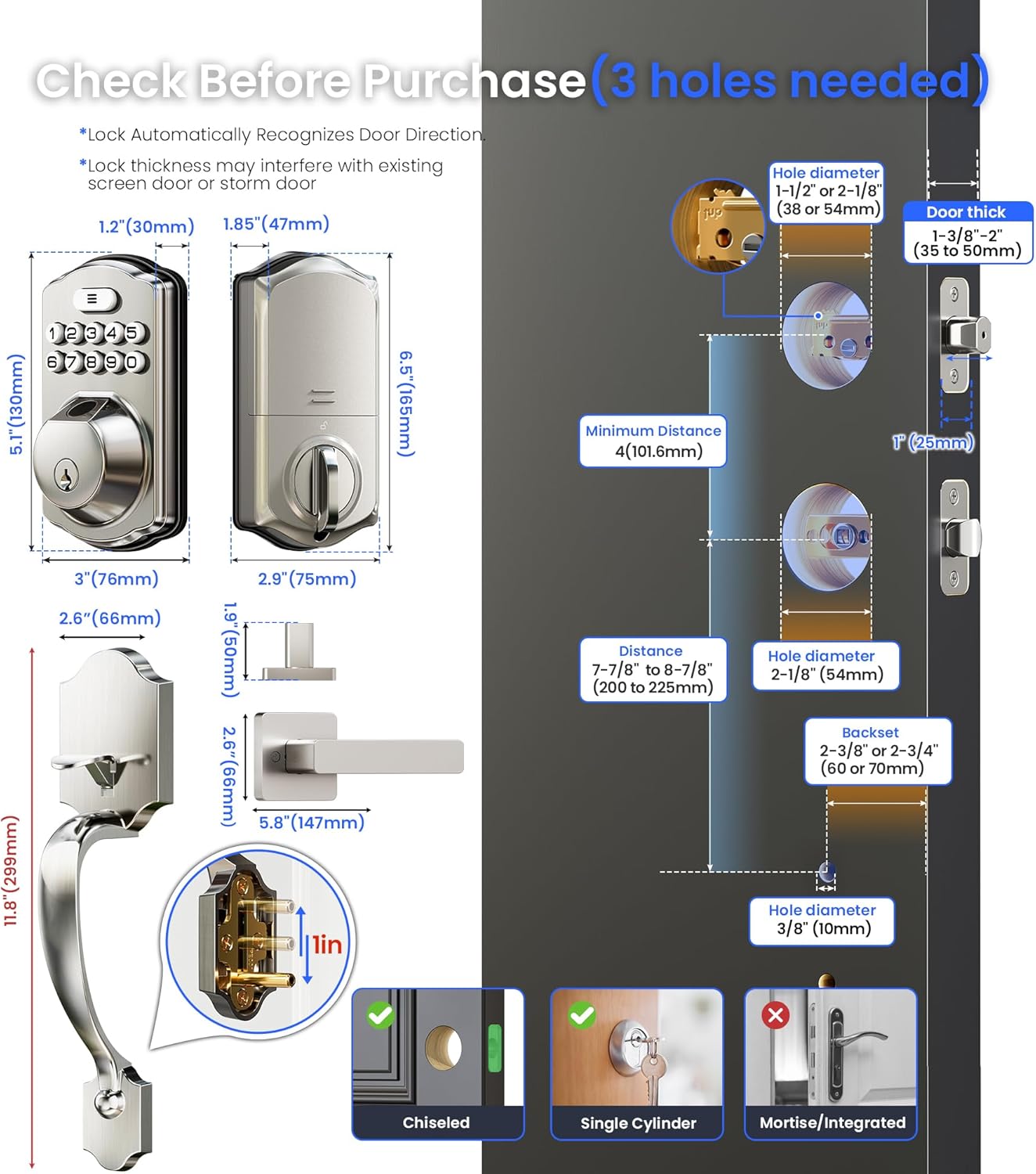Certified Highest Durability: Smart door lock with handle set complies with BHMA/ANSI standards, IP55 waterproof rating, backlit keypad, runs on 8 AA batteries (not included) for extended life and consistent performance. Crafted with premium zinc alloy metal materials and masterful craftsmanship, it delivers robust protection and peace of mind for everyday use