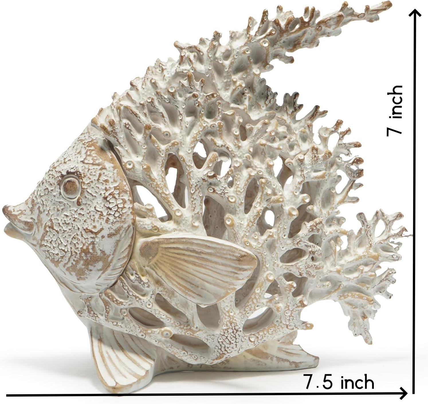 Angelfish sculpture beach decor, made of polystone with a unique look of a carved piece of coral sized to fit most anywhere, measures 7.5in x 7in.