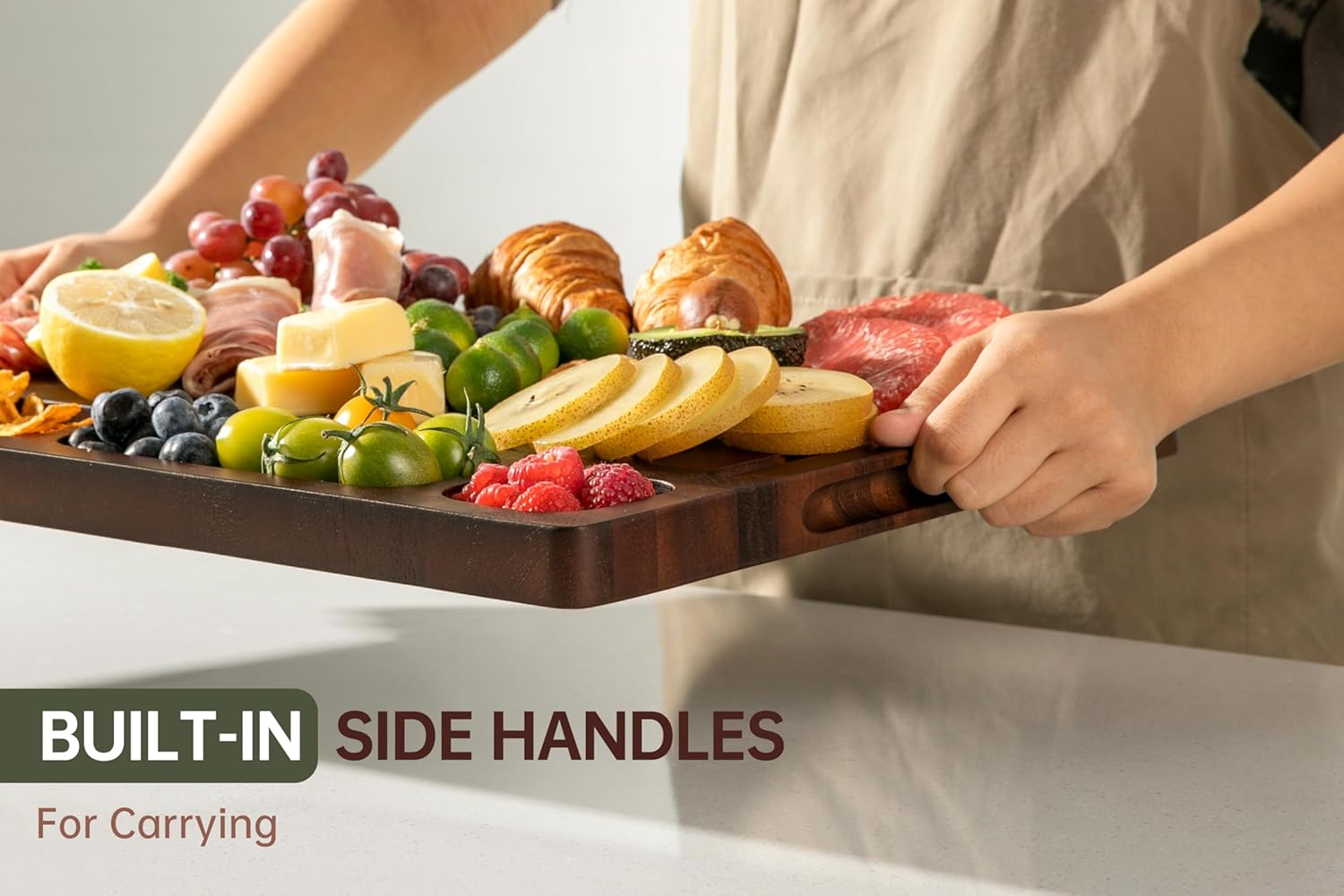 THOUGHTFUL CRAFTED DESIGN: This black walnut cutting board has built-in compartments, ergonomic handles, and removable non-slip feet—self-adhesive and easy to attach or remove as needed. It’s made for home cooks who want both functionality and refinement. It moves smoothly from meal prep to table service, making busy weeknight ingredient prep a breeze and shining for serving charcuterie at weekend party.