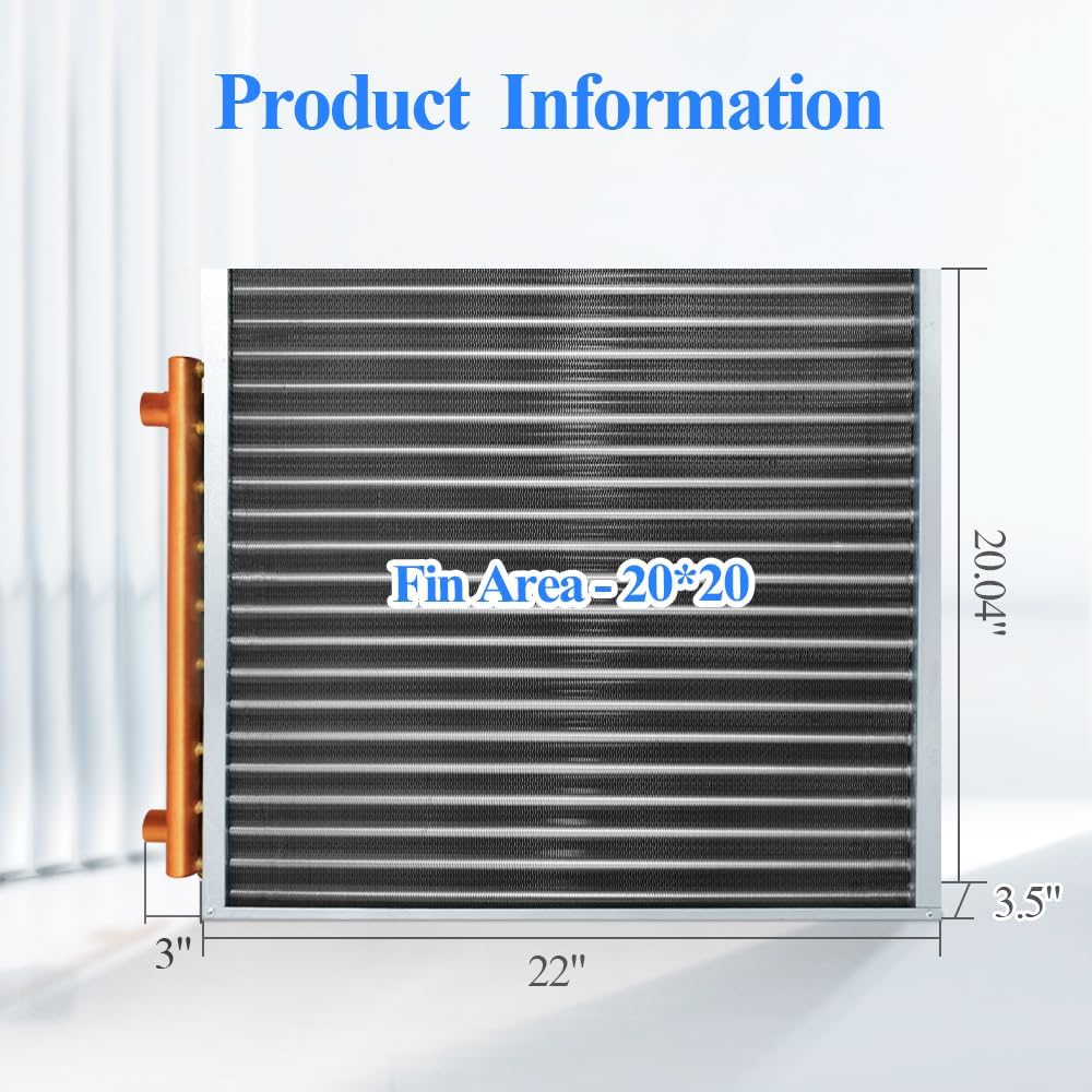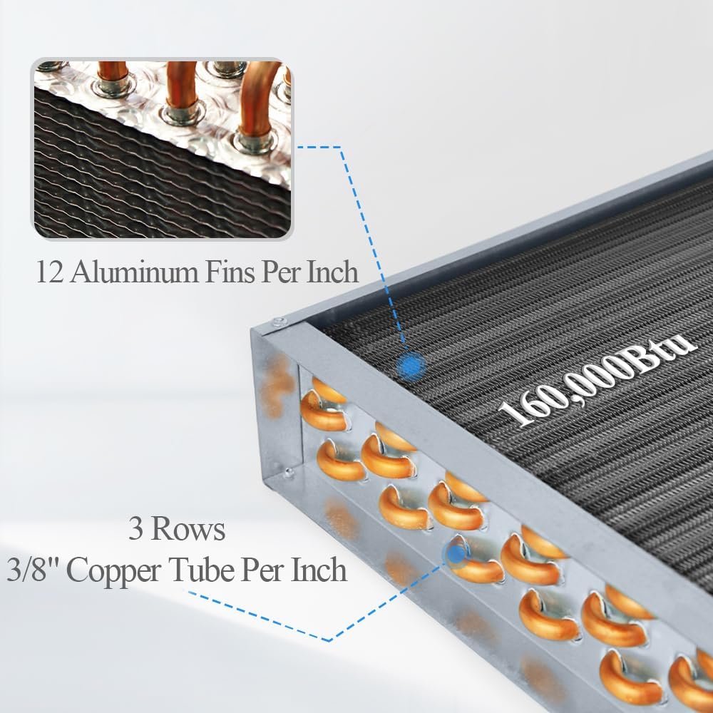 【Excepetional Performance】The heat exchanger has a capacity of 160,000 Btu. Depending on the application, the heat exchanger can produce up to 360kBtu of heat per hour, with 12 aluminum fins and 3 rows of 3/8″ seamless copper tubes per inch. The combination of wavy fins and seamless copper tubes, which enhanced contact areas both inside and outside the tubes, increasing in heat transfer performance, maximizing heating or cooling efficiency.