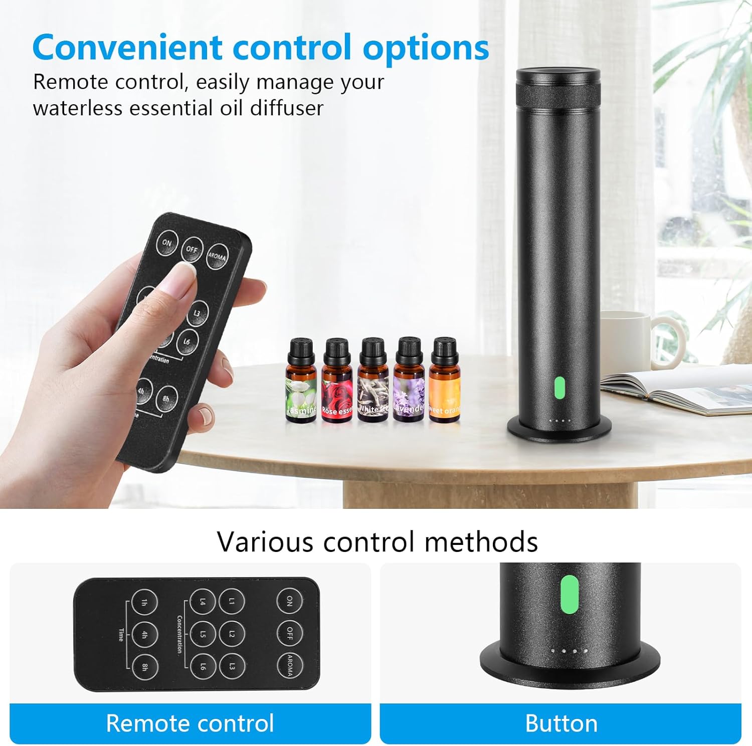 【Smart Remote Control Operation】Adjust scent intensity and set 1-12hr timers effortlessly via included remote; Ultra-quiet air diffuser works seamlessly as hotel scent diffuser or home fragrance solution.