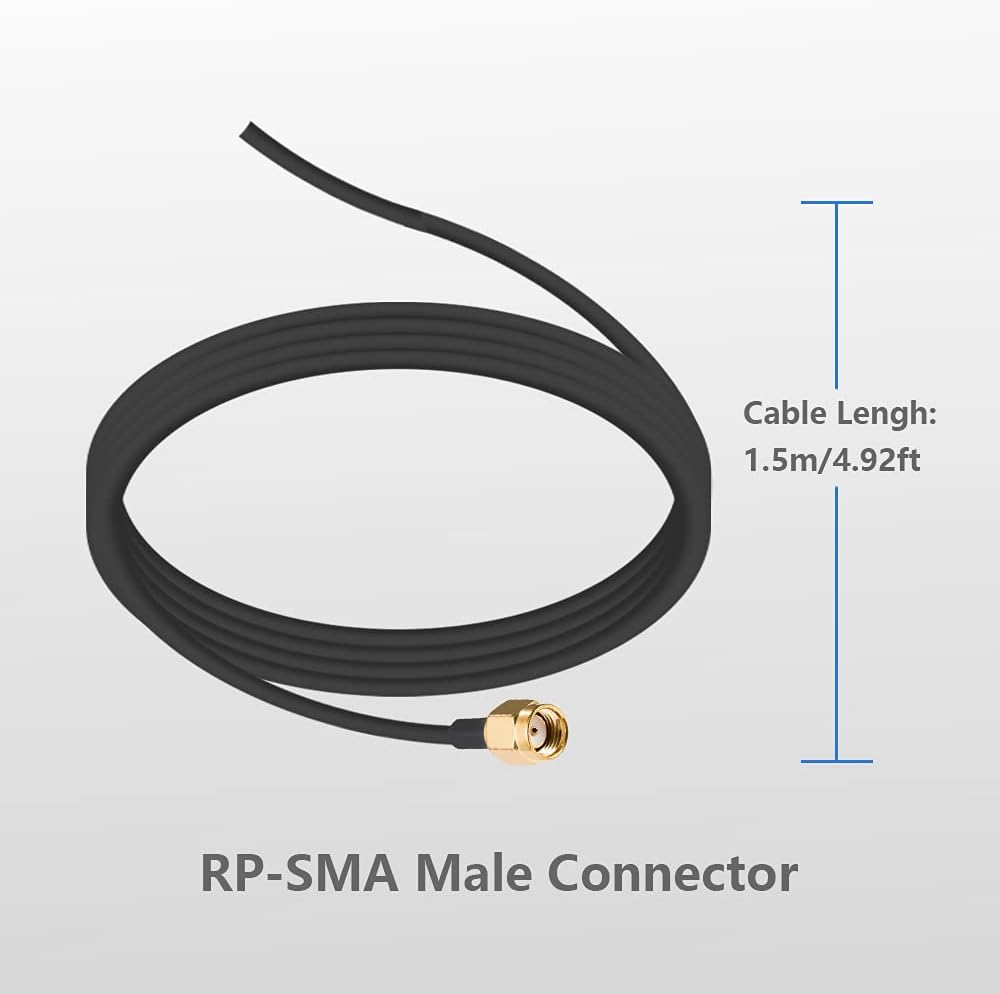 Cable type/length: RG174 / 1.5M (4.9 feet)| Adapter Type: RP-SMA male adapter | Working frequency: 2400-2500MHz / 5150-5850MHz | Gain: 12dBi | Transmission rate:3000Mbps | Impedance: 50Ohm | Power: 50W | Antenna length:22cm | Working voltage: 100V.