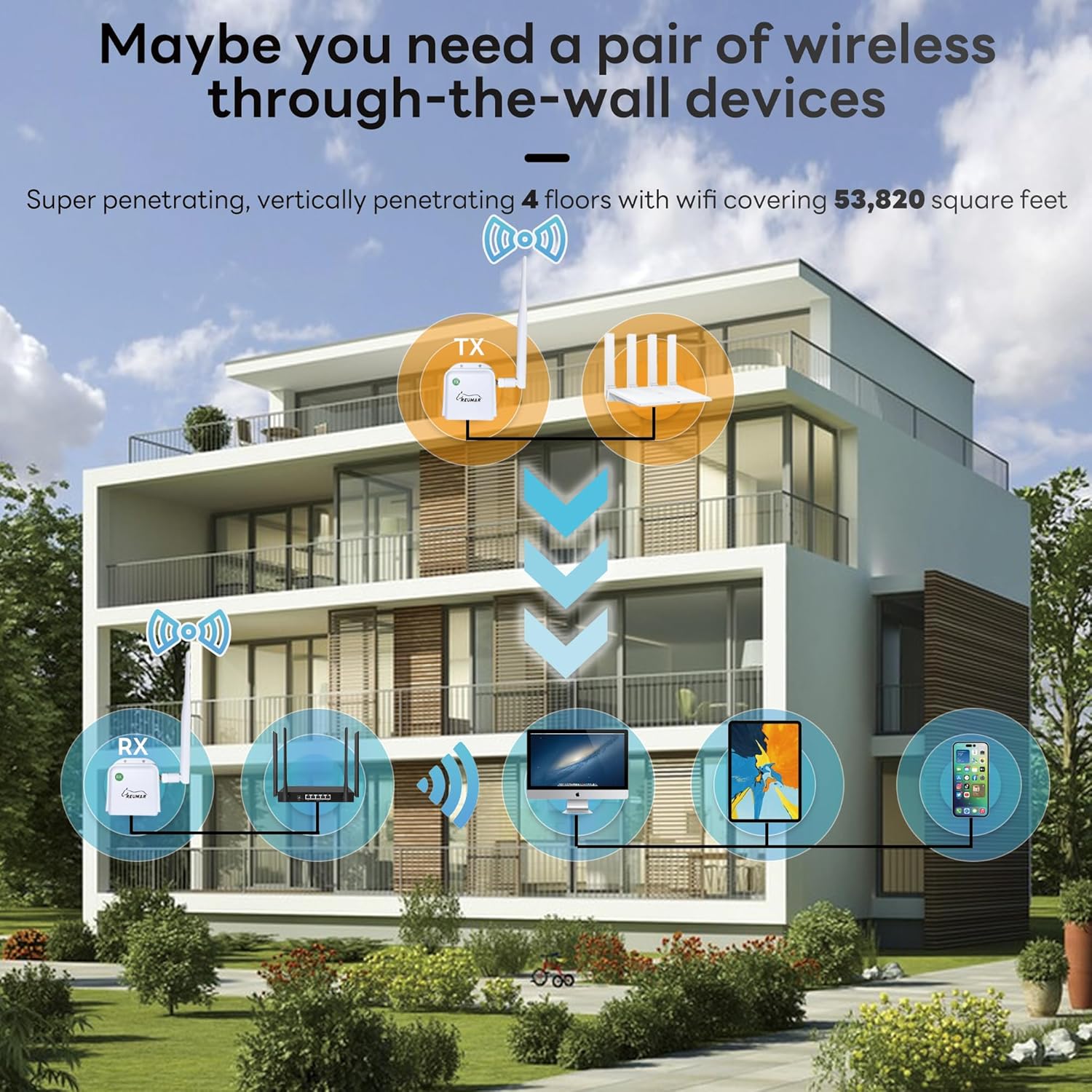 【𝗟𝗼𝗻𝗴-𝗱𝗶𝘀𝘁𝗮𝗻𝗰𝗲 𝘁𝗿𝗮𝗻𝘀𝗺𝗶𝘀𝘀𝗶𝗼𝗻】REUMAR WiFi Extender built-in Omni-directional antenna,The transmission distance is considerable, with a visual range of up to 1000 meters, Easily penetrate through three walls.